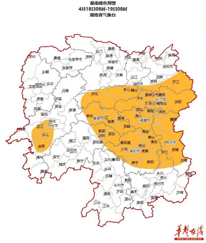 湖南省气象台4月18日06时发布暴雨橙色预警:预计18日08时至19日08时,长沙、株洲、湘潭、衡阳、邵阳东部、岳阳南部、益阳南部、怀化中南部、郴州北部、娄底将出现暴雨,局地大暴雨,并伴有短时强降水、雷雨大风、冰雹等强对流天气,请加强防范。