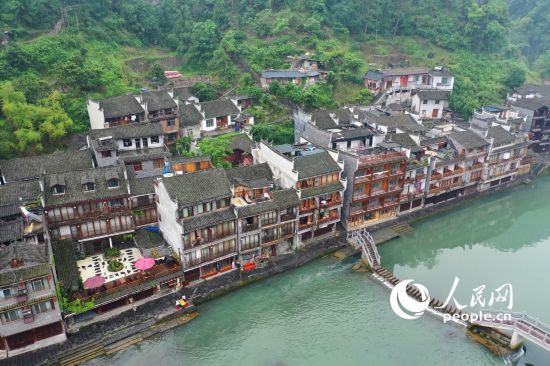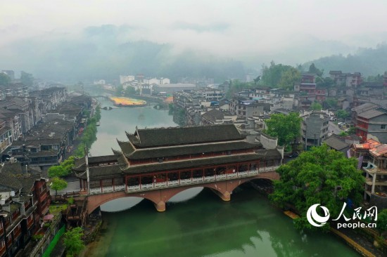 人民网湖南5月16日电 (记者王天乐 车柯蒙)湖南省湘西土家族苗族自治州凤凰县境内,紧邻沱江的凤凰古城在雨后云雾缭绕,宛若画卷。
