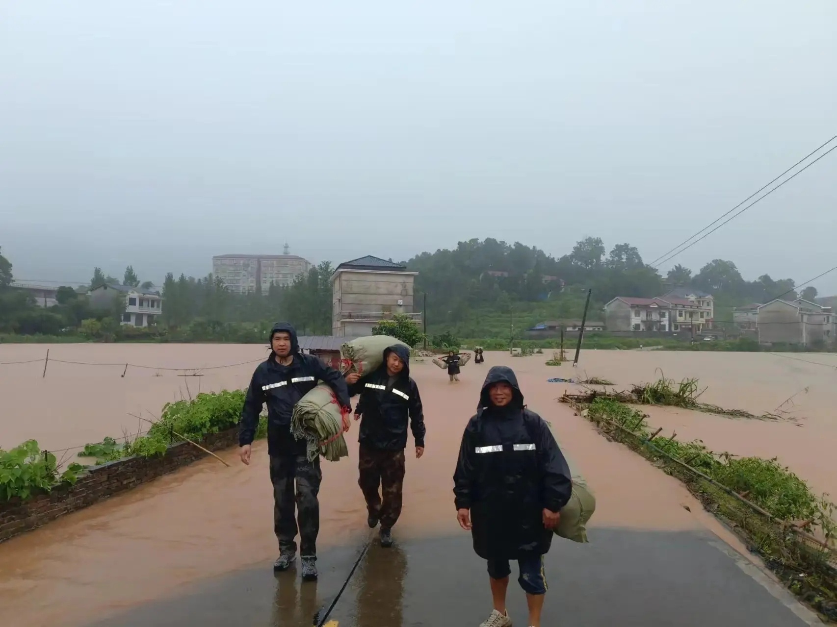 7月1日怀化辰溪县长田湾水库管理所党员干部徒步运送抢险物资。资料图片