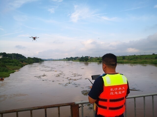 湖南水文应急监测队员利用无人机搭载雷达波实施应急流量测验。王亮摄