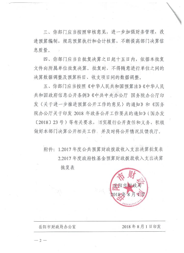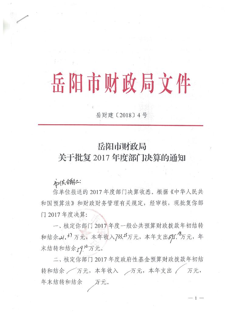 附:岳阳市财政局《关于批复2017年度部门决算的通知》(岳财建〔2018〕4号)