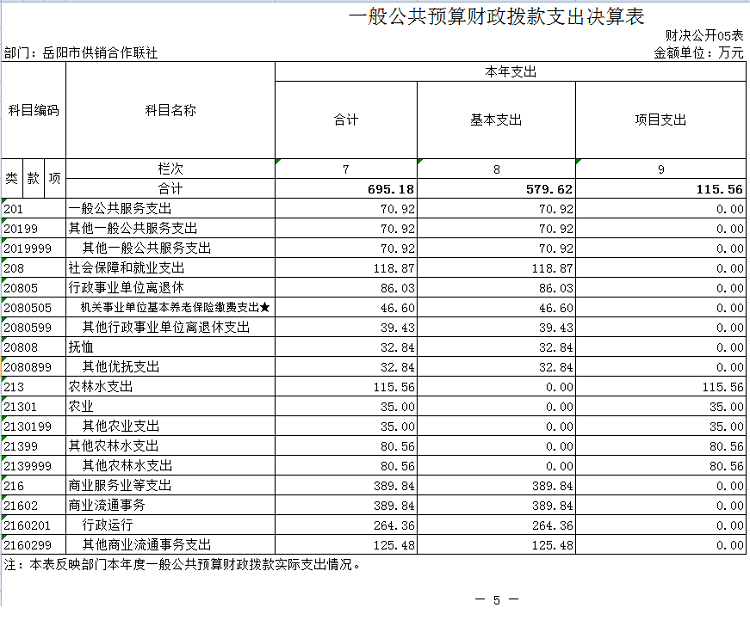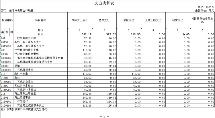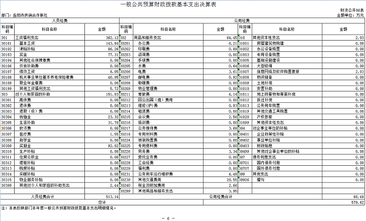 岳阳市供销社2017年度财政拨款基本支出579.62万元,其中:人员经费513.14万元占基本支出的88.53%,主要包括:基本工资、津贴补贴、绩效工资、其他社会保障缴费、其他工资福利支出、退休费、抚恤金、生活补助、医疗费、奖励金、其他对个人和家庭的补助支出;公用经费66.48万元占基本支出的11.47%,主要包括:办公费、印刷费、水费、电费、差旅费、维修(护)费、会议费、培训费、公务接待费、劳务费、工会经费、公务用车运行维护费、其他交通费用、税金及附加费用、其他商品和服务支出、办公设备购置。