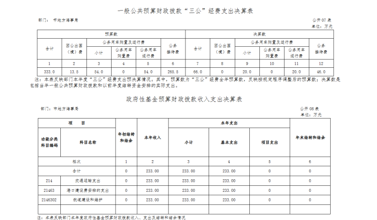 2020年度政府性基金预算财政拨款收入233万元;年初结转和结余0万元;支出233万元,其中基本支出233万元,项目支出0万元;年末结转和结余0万元。