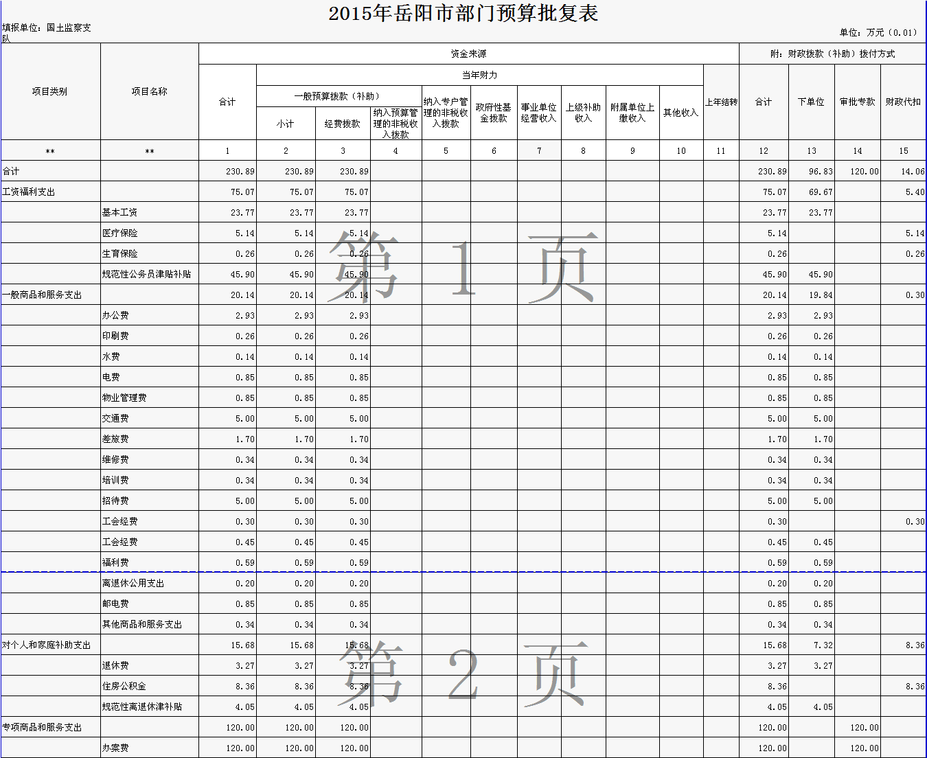 2015年度岳阳市国土资源局执法监察支队部门预算批复表