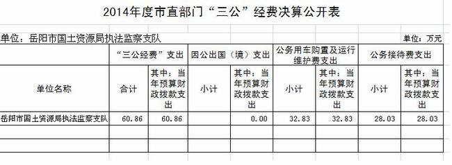 2014年度岳阳市国土资源局执法监察支队“三公”经费决算公开表