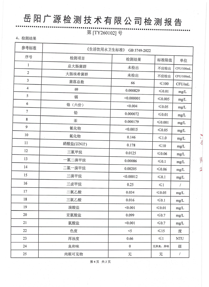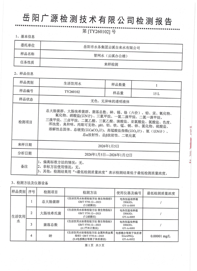 2026年1月岳阳市水务集团管网水水质检测月报表