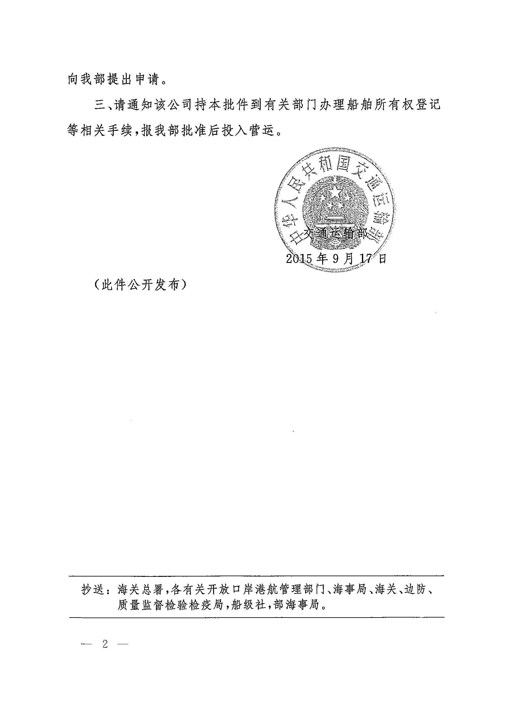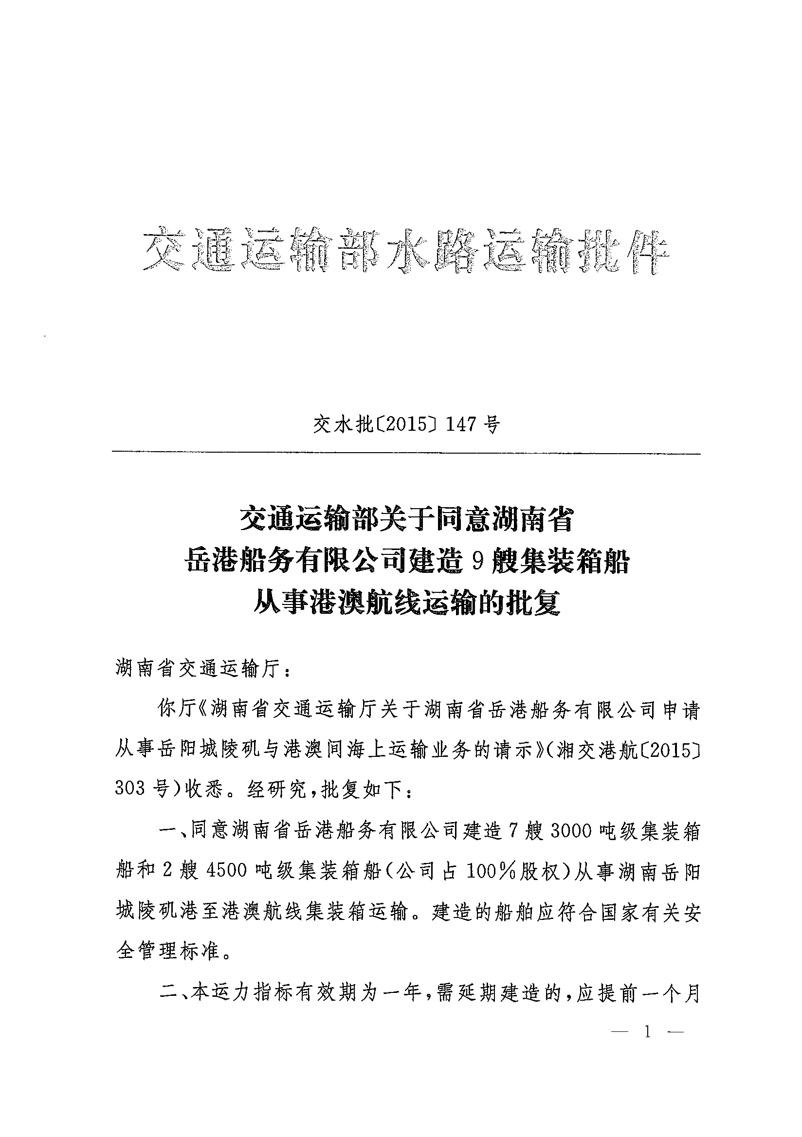 交通运输部关于同意湖南省岳港船务有限公司建造9艘集装箱船从事港澳航线运输的批复