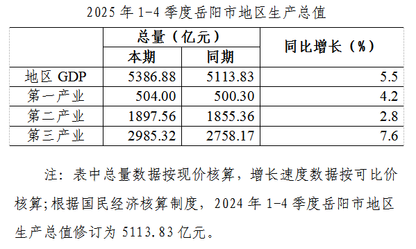 根据地区生产总值统一核算结果,2025年1-4季度岳阳市地区生产总值5386.88亿元,按可比价格计算,同比增长5.5%。分产业看,第一产业增加值504.00亿元,增长4.2%;第二产业增加值1897.56亿元,增长2.8%,第三产业增加值2985.32亿元,增长7.6%。