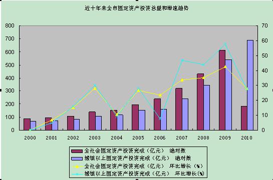 2010年,全市上下认真贯彻落实市委、市政府“提速、升级、增效、惠民”发展战略,紧紧把握国家宏观调控政策机遇,强力推进项目建设,不断扩大投资规模,调整优化投资结构,促进了全市固定资产投资呈现增速加快、结构优化、活力增强的良好局面。