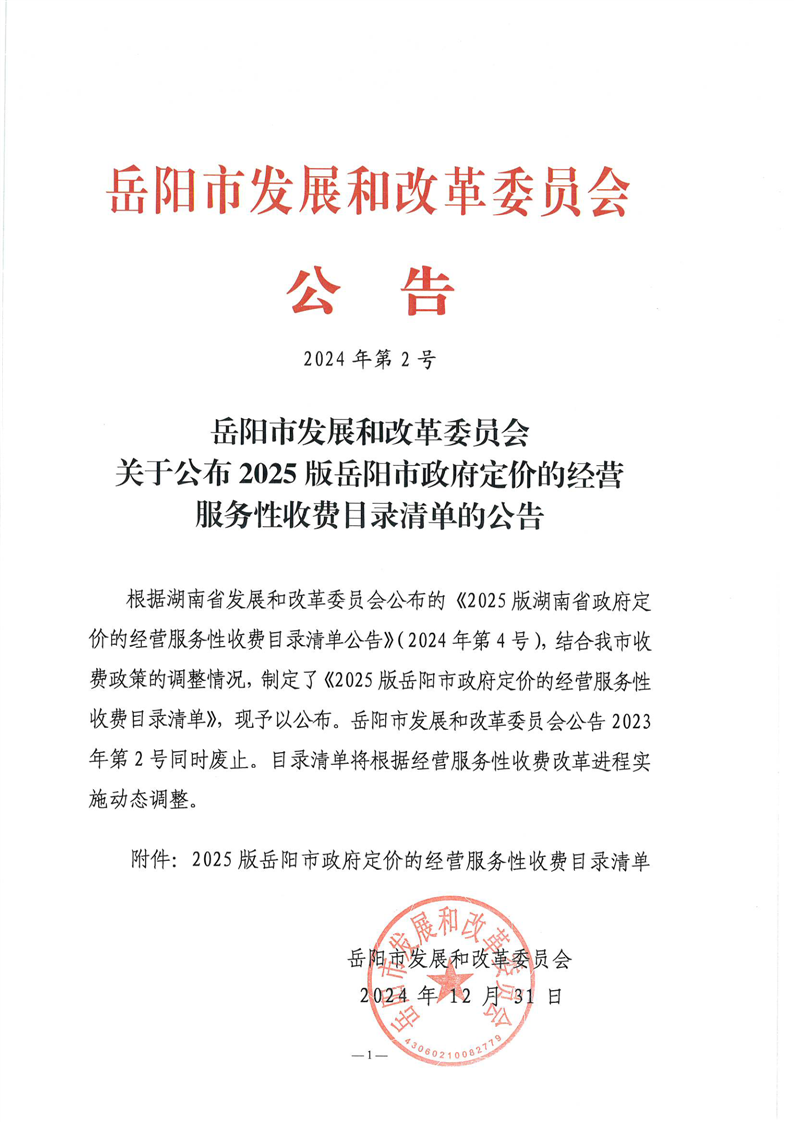 关于公布2025版岳阳市政府定价的经营服务性收费目录清单的公告