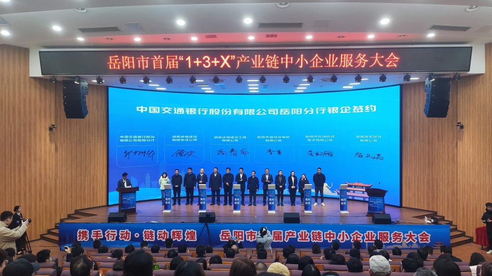 大会围绕我市“1+3+X”现代产业体系建设,以“携手行动 链动辉煌”为主题,围绕“融资促进、数智赋能”等重点领域,通过举办“携手行动”专题活动,聚焦上下推动、市场带动合力,对接优质服务资源,为中小企业搭平台、打标签,助力中小企业高质量发展。会上,介绍了我市服务中小企业的相关举措和办法,现场为岳阳96871直播中心授牌,对湖南省“智赋万企”企业直播大赛岳阳初赛获奖者进行了颁奖,举行了战略合作协议签约和银企签约活动,中国银行岳阳分行、中国工商银行岳阳分行、交通银行岳阳分行分别与15家企业进行现场签约,实际纯信用授信金额共计1.3亿元。
