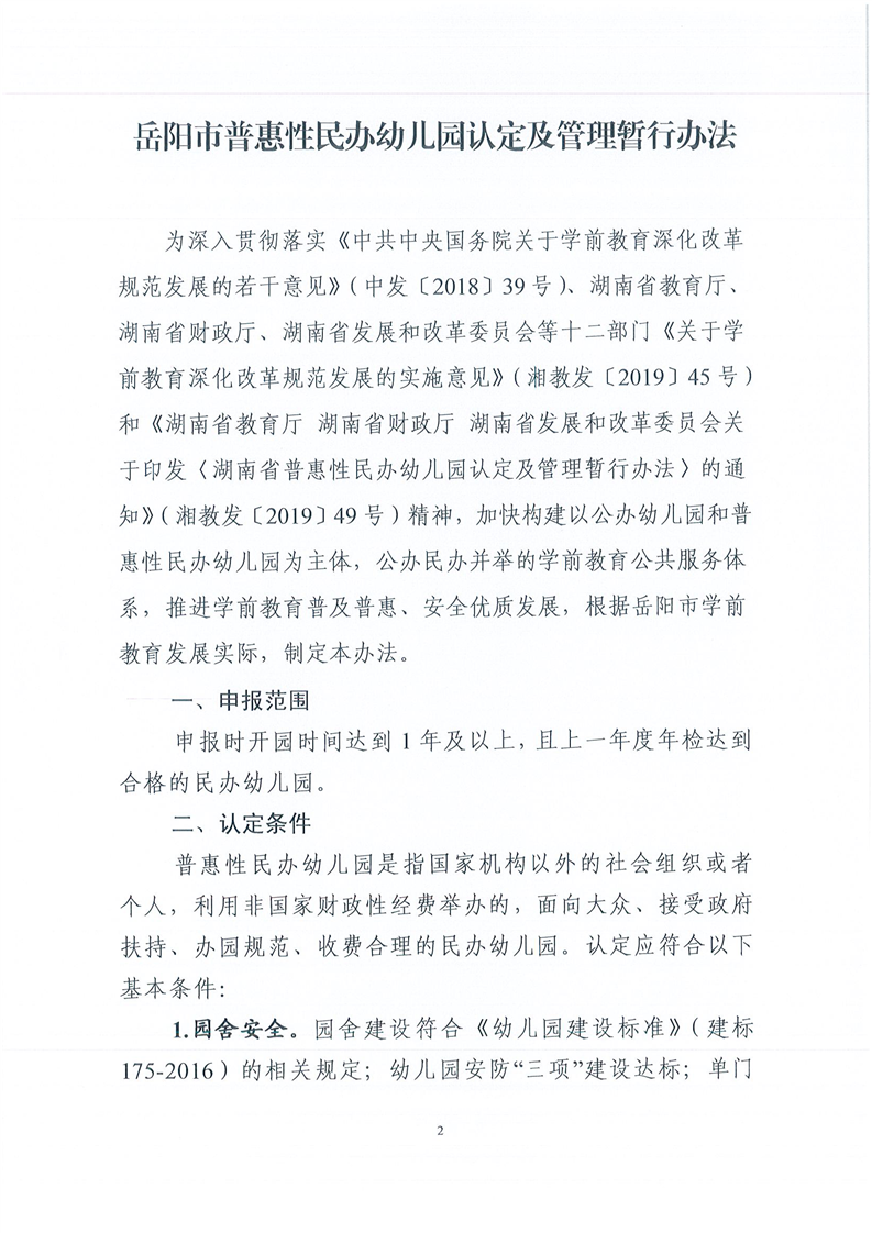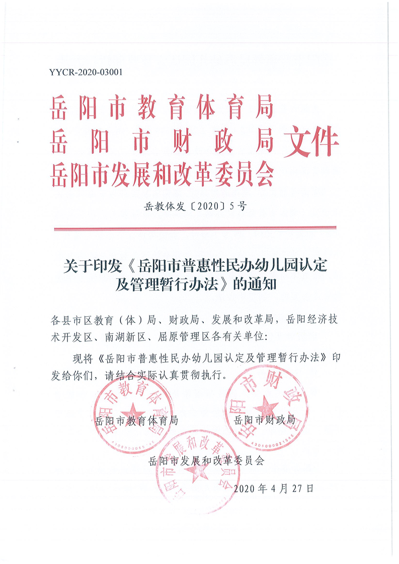 岳阳市教育体育局、岳阳市财政局、岳阳市发展和改革委员会关于印发《岳阳市普惠性民办幼儿园认定及管理暂行办法》的通知