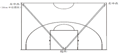 测试方法:受试者在起点运球,计时开始,按图中箭头所示方向单手运球至边线中点,脚触及中点圆弧后运球返回至起点,再运球至另一侧边线中点,脚触及圆弧,运球返回至起点,脚触及起点圆弧时停表计时。受试者测试两次,取成绩最好的一次。计数单位为秒。