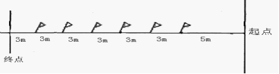 场地器材:足球场或平整场地、足球、秒表、6根标志杆。画一条长23m的直线,一端为起点,起点线至第一杆距离为5m,其他各杆间距为3m,共设6根标志杆,距最后一根杆3米为终点线。