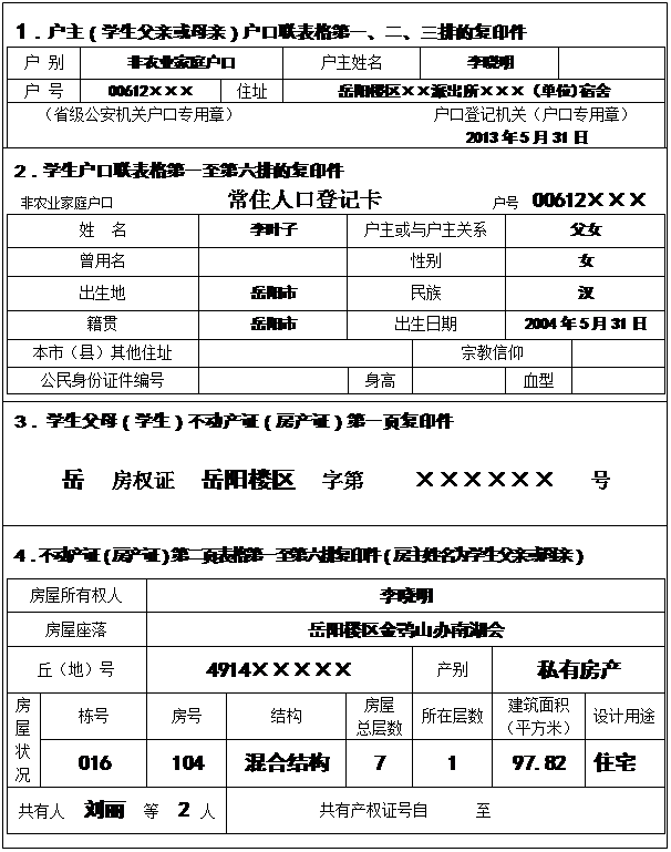 2.家庭详细住址需具体到所在街道(门牌号)、小区(单位)、楼栋号、单元号、楼层数。“房产证号”填写房产权证编号,不能填写总证号或丘号,不动产证(房产证)号复印件应与表格填写的号码一致。“户口簿户号”填写首页编号。