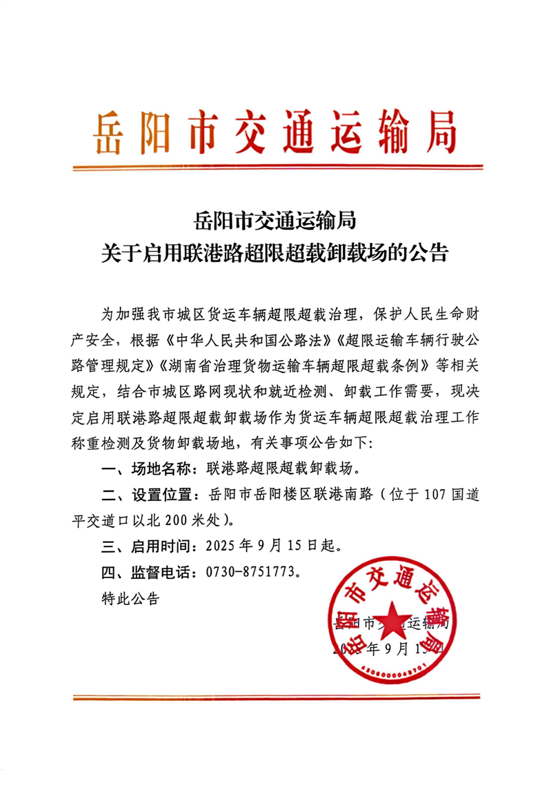 岳阳市交通运输局关于启用联港路超限超载卸载场的公告