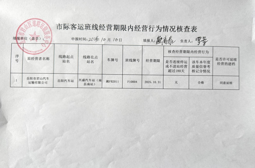 关于岳阳市君山汽车运输有限公司岳阳至南县班线延续经营的公示