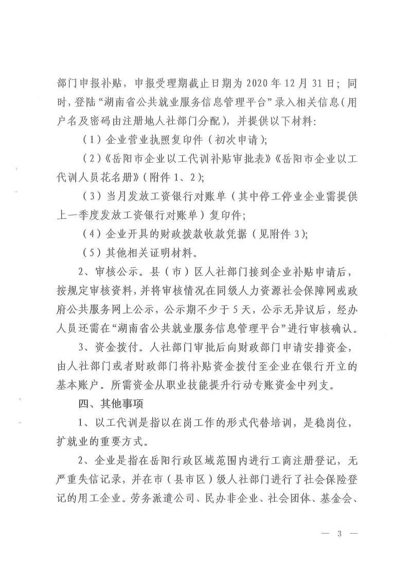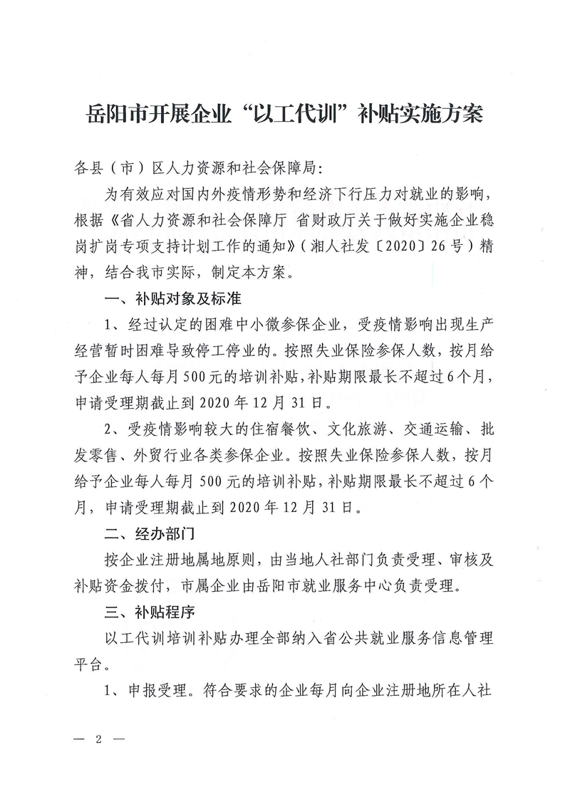 岳阳市以工代训实施办法(岳人社发【2020】47号)