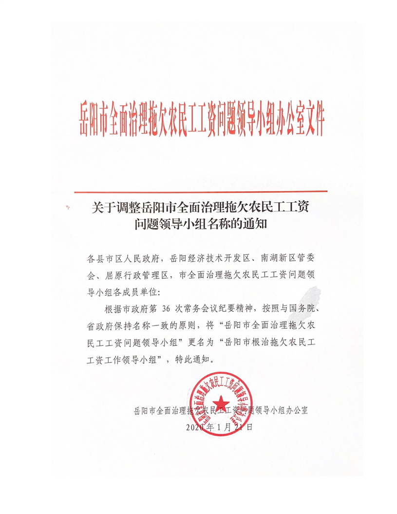 关于调整岳阳市全面治理拖欠农民工工资问题领导小组名称的通知