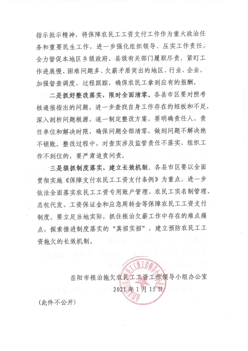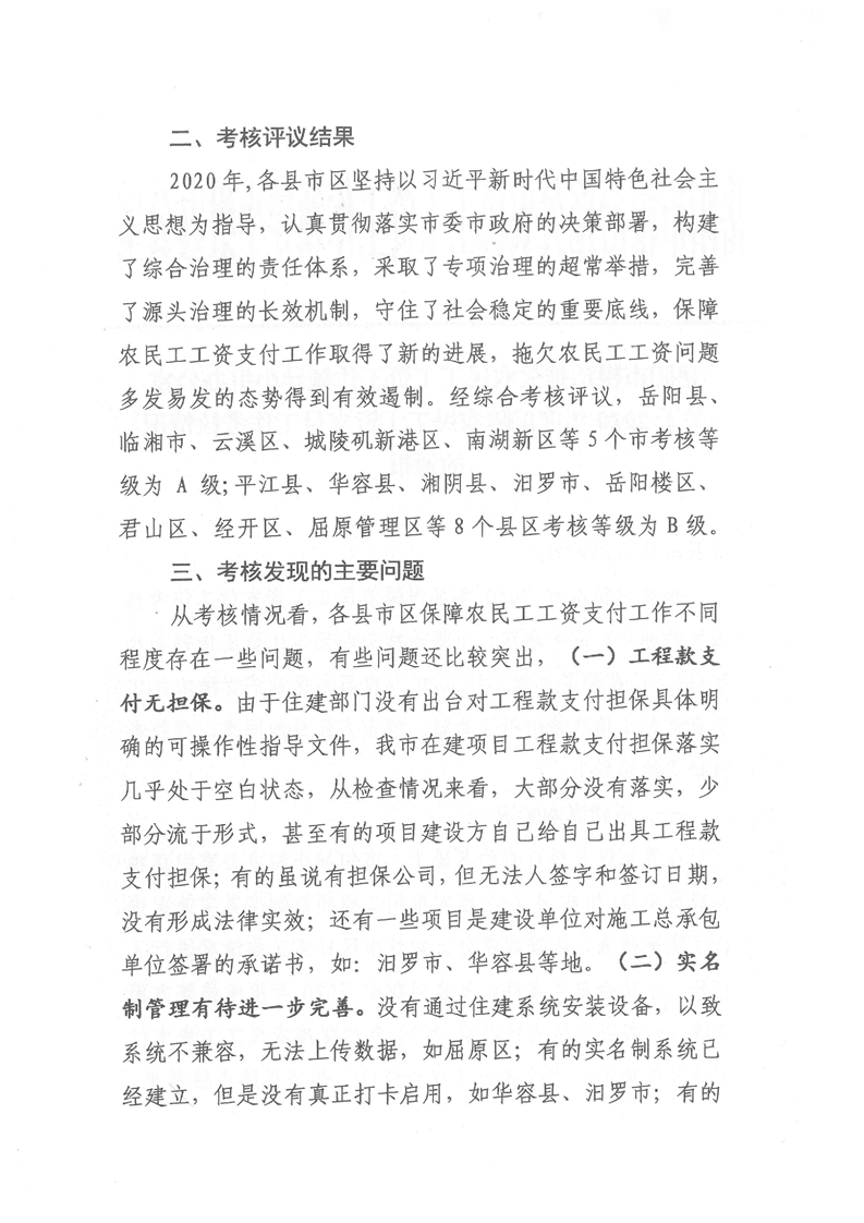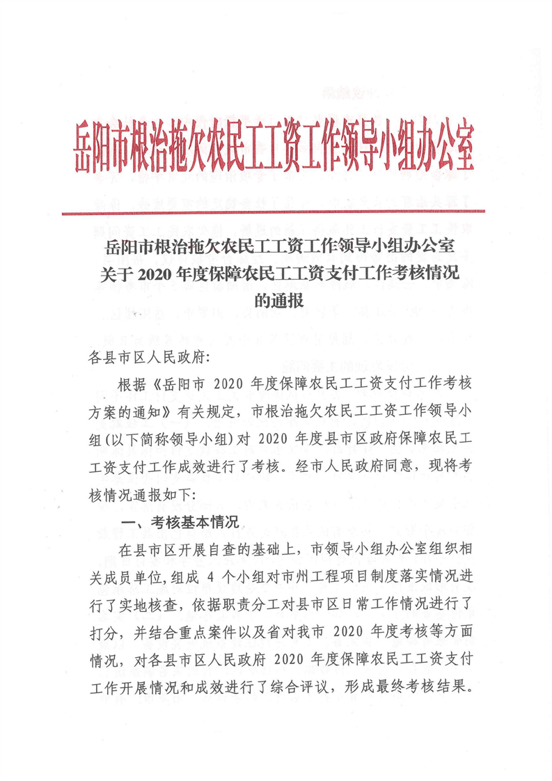 岳阳市根治拖欠农民工工资工作领导小组办公室关于2020年度保障农民工工资支付工作考核情况的通报