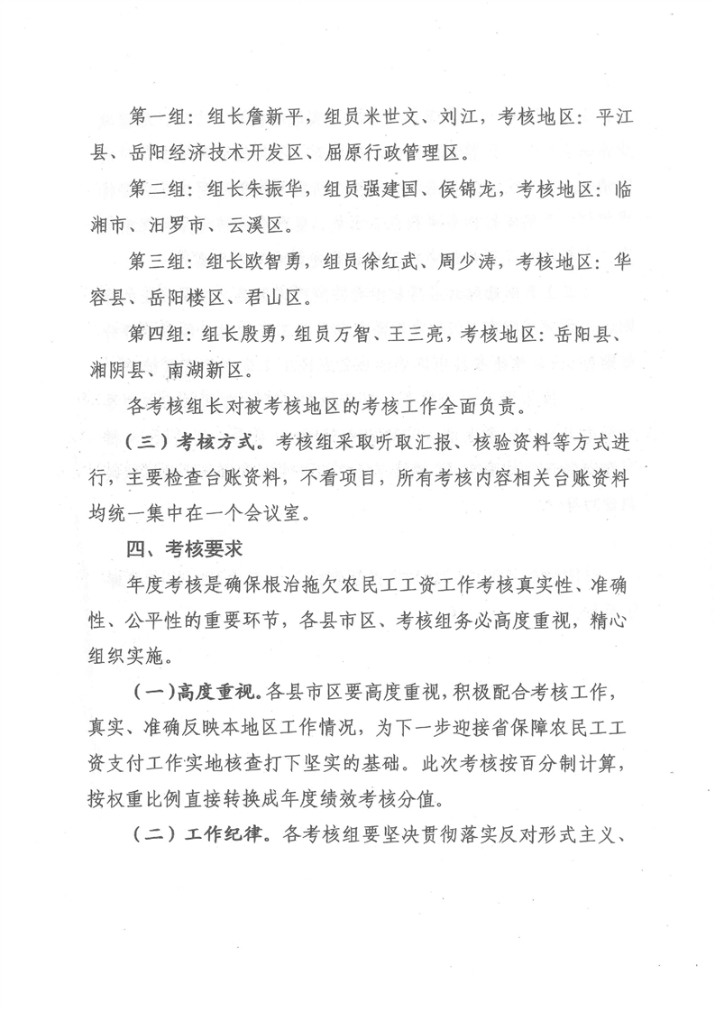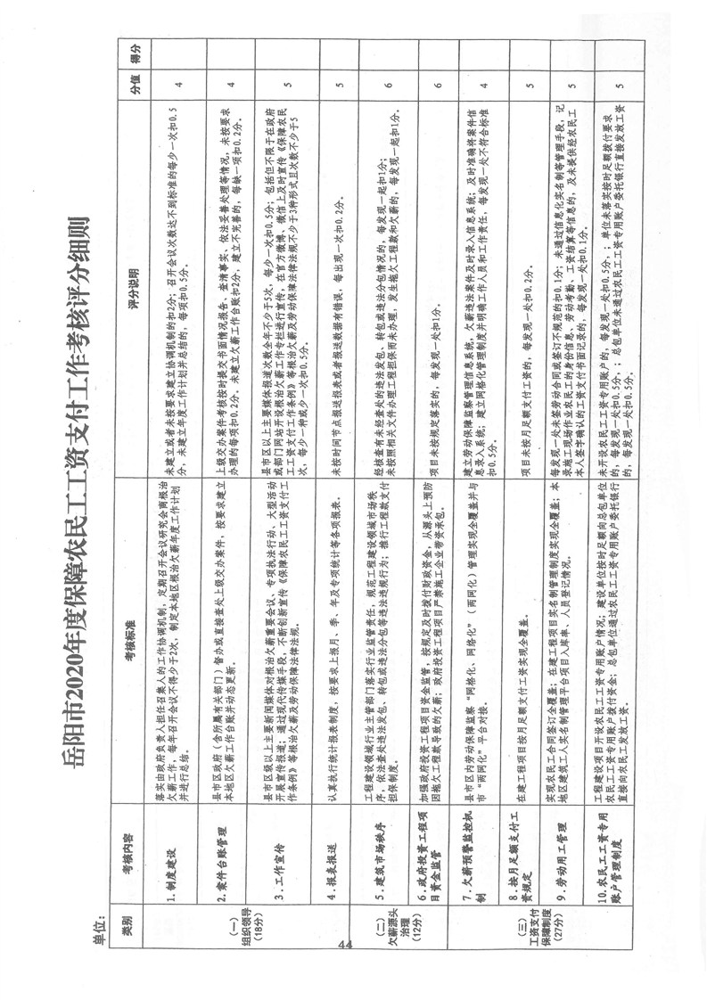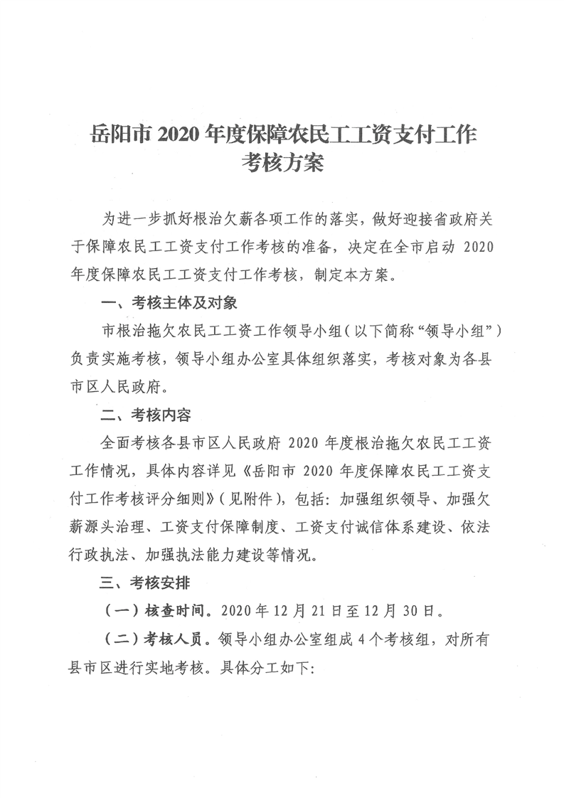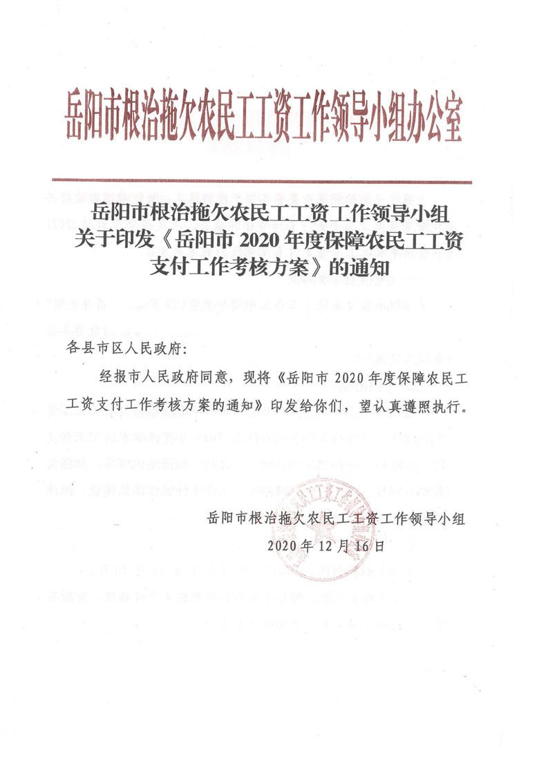岳阳市根治拖欠农民工工资工作领导小组关于印发《岳阳市 2020年度保障农民工工资支付工作考核方案》的通知