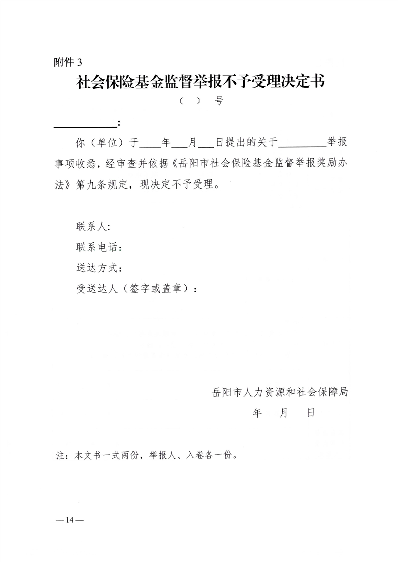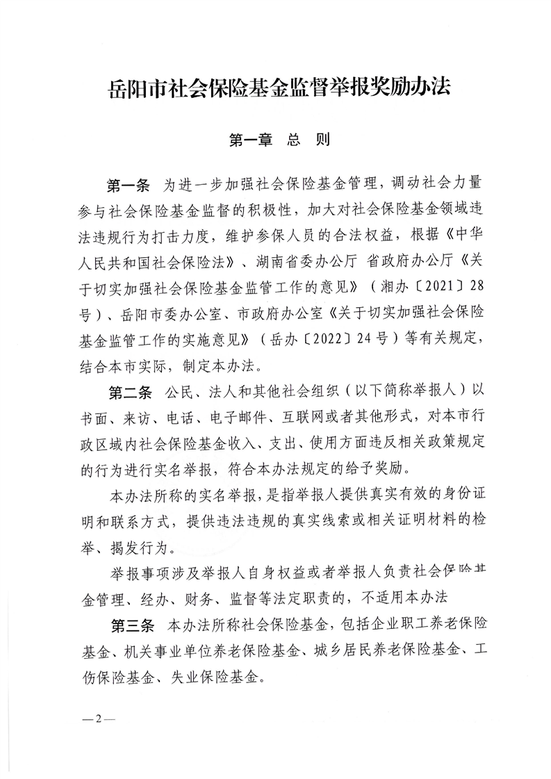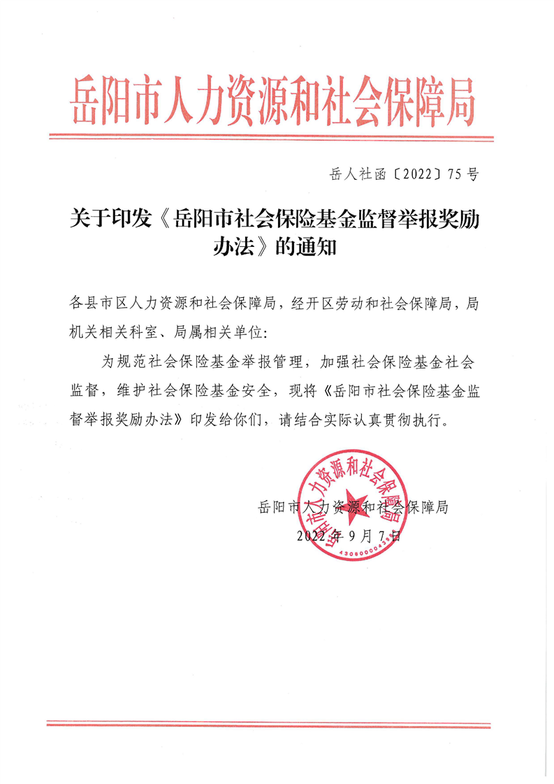 关于印发《岳阳市社会保险基金监督举报奖励办法》的通知