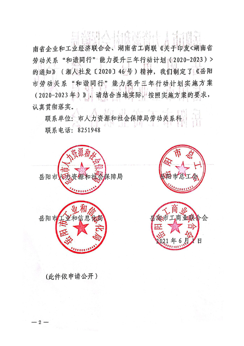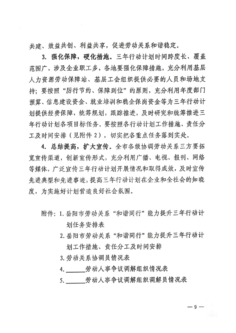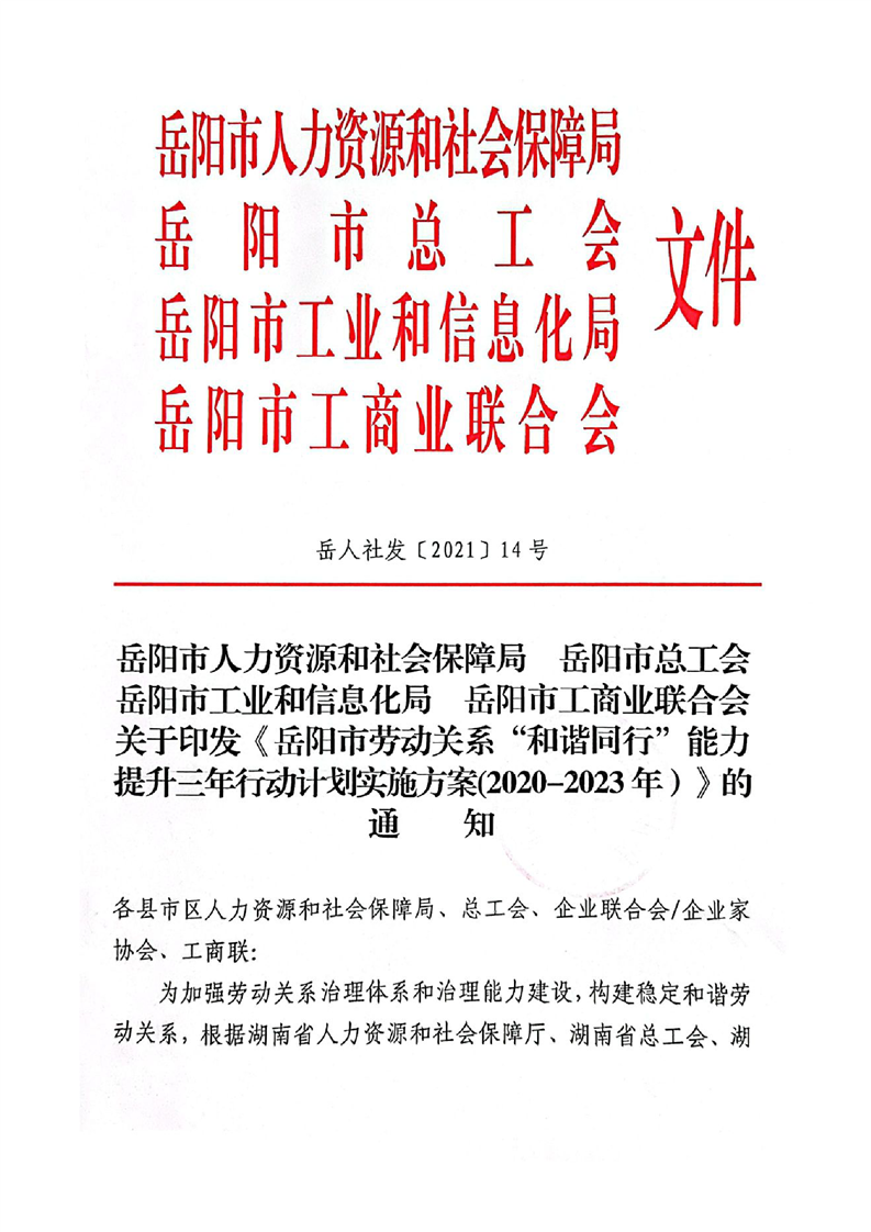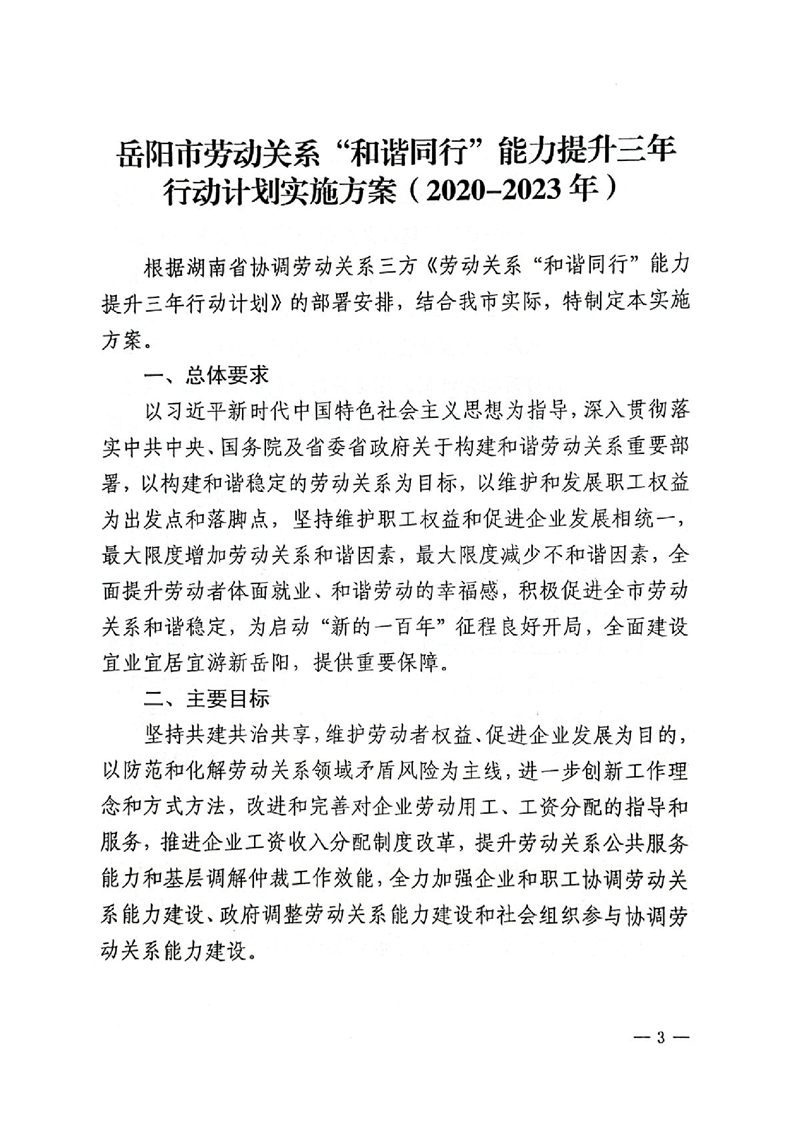 关于印发《岳阳市劳动关系”和谐同行”能力提升三年行动计划实施方案(2020-2023年)》的通知