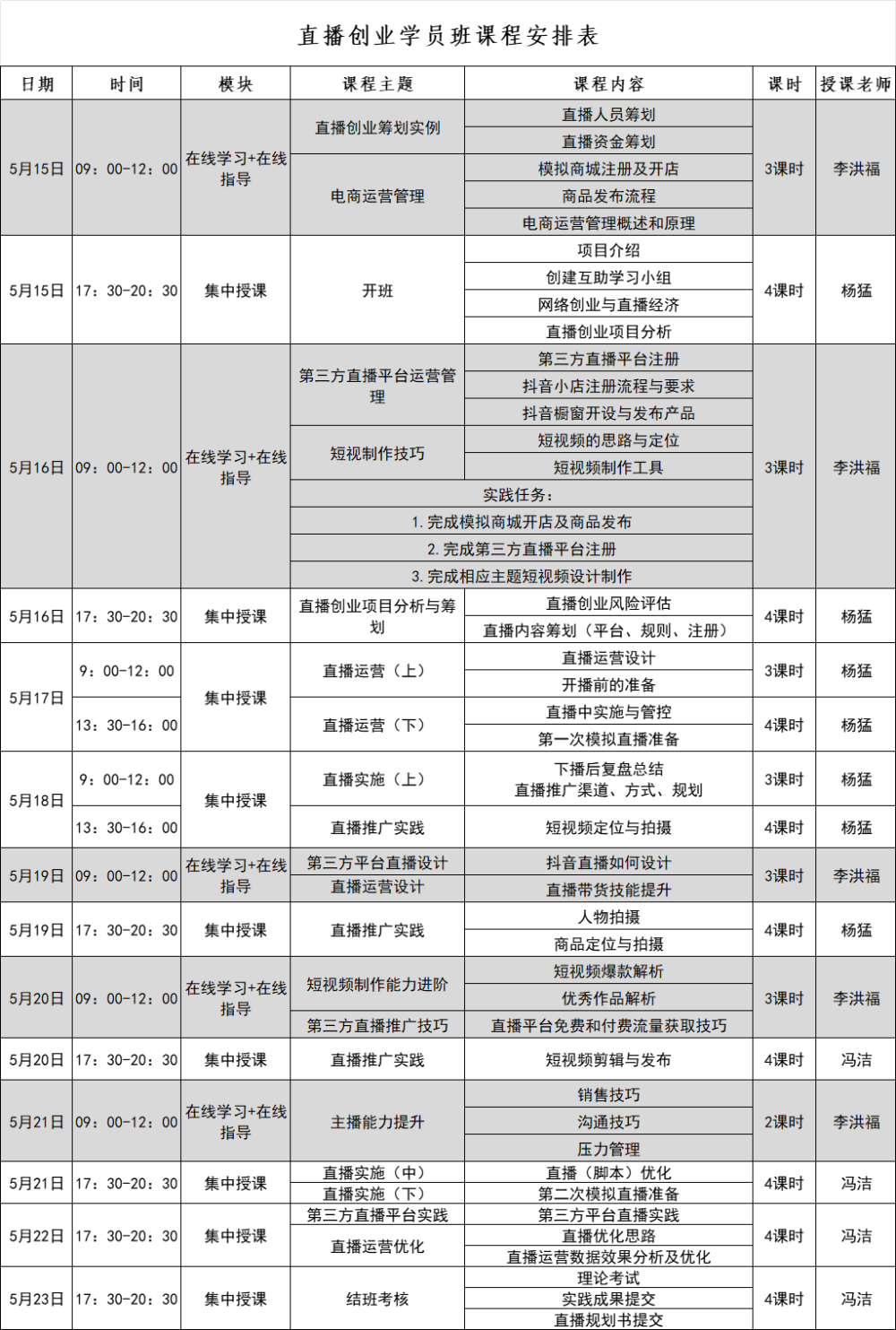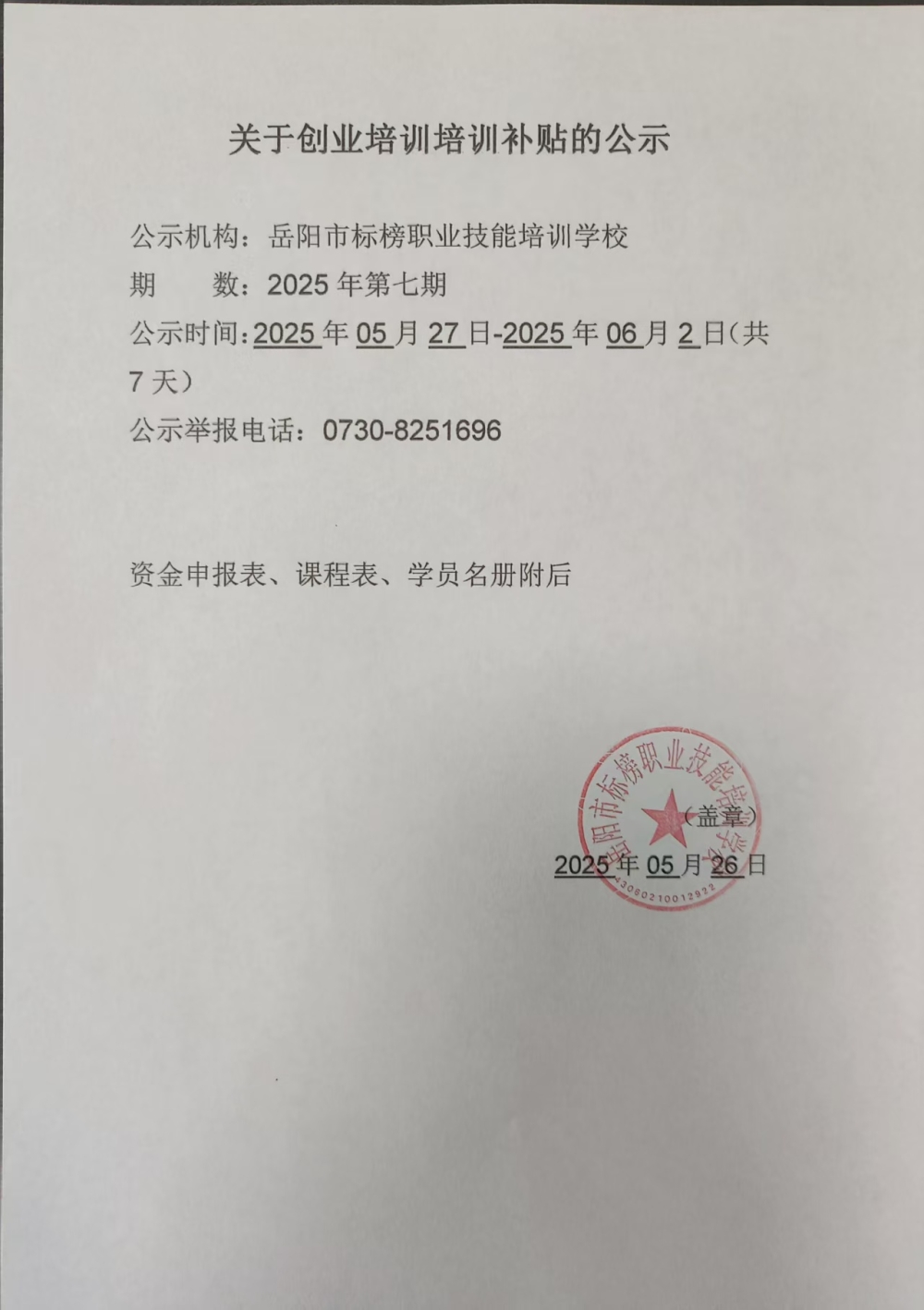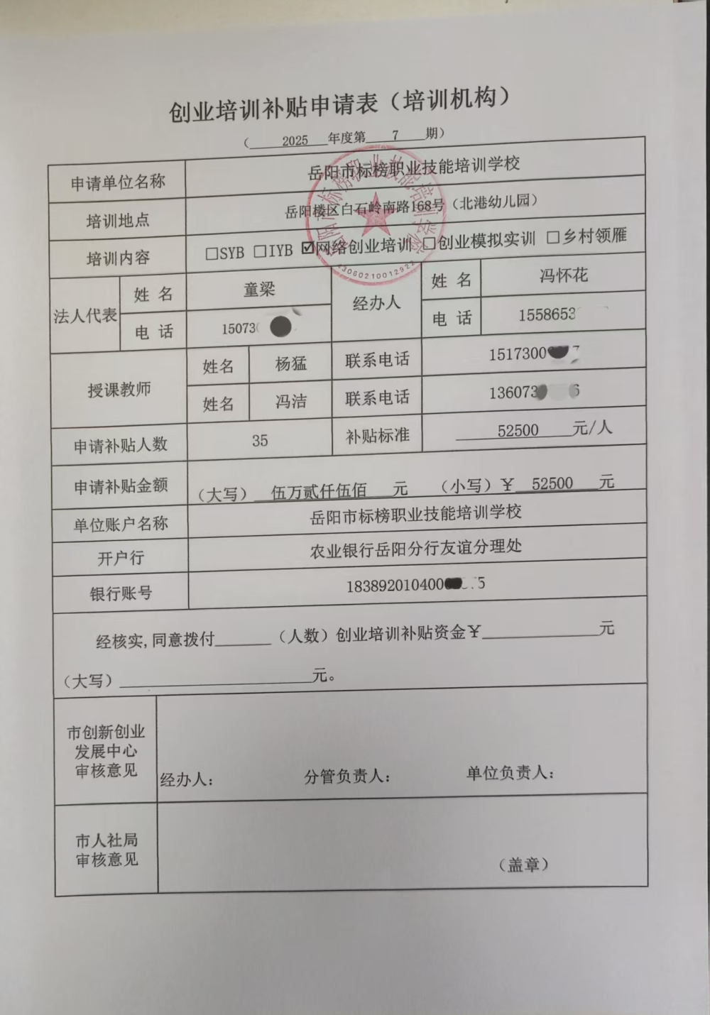 岳阳市标榜职业技能培训学校2025年第七期网络创业培训资金申请表、课程表、学员名册
