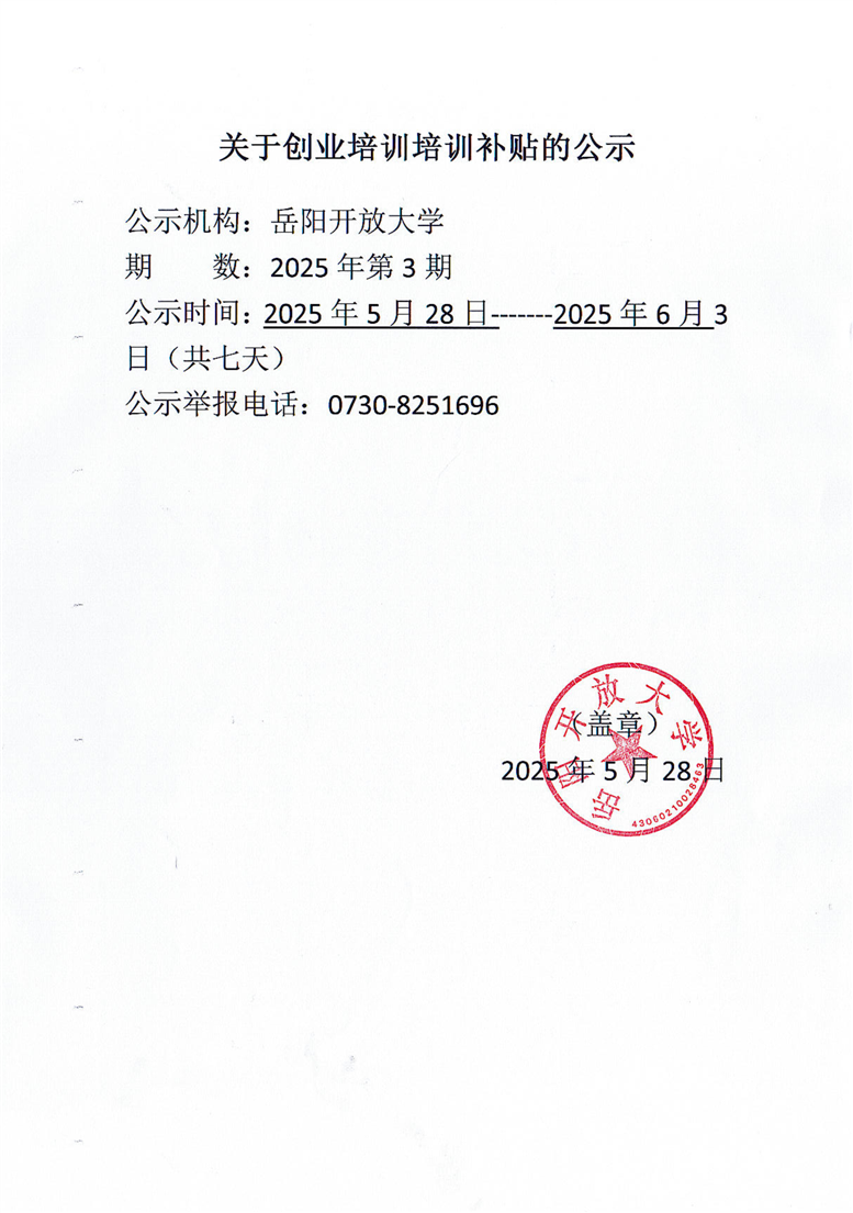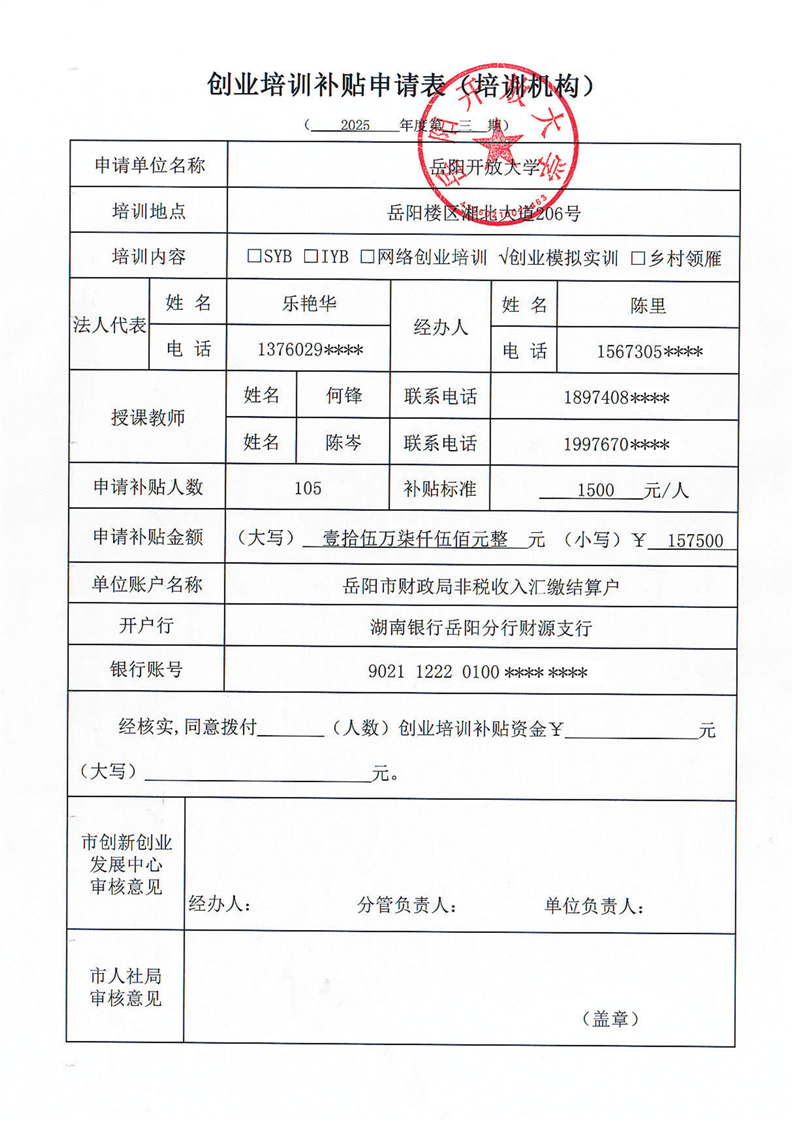 岳阳开放大学2025年第三期创业模拟实训资金申请表、课程表、学员名册