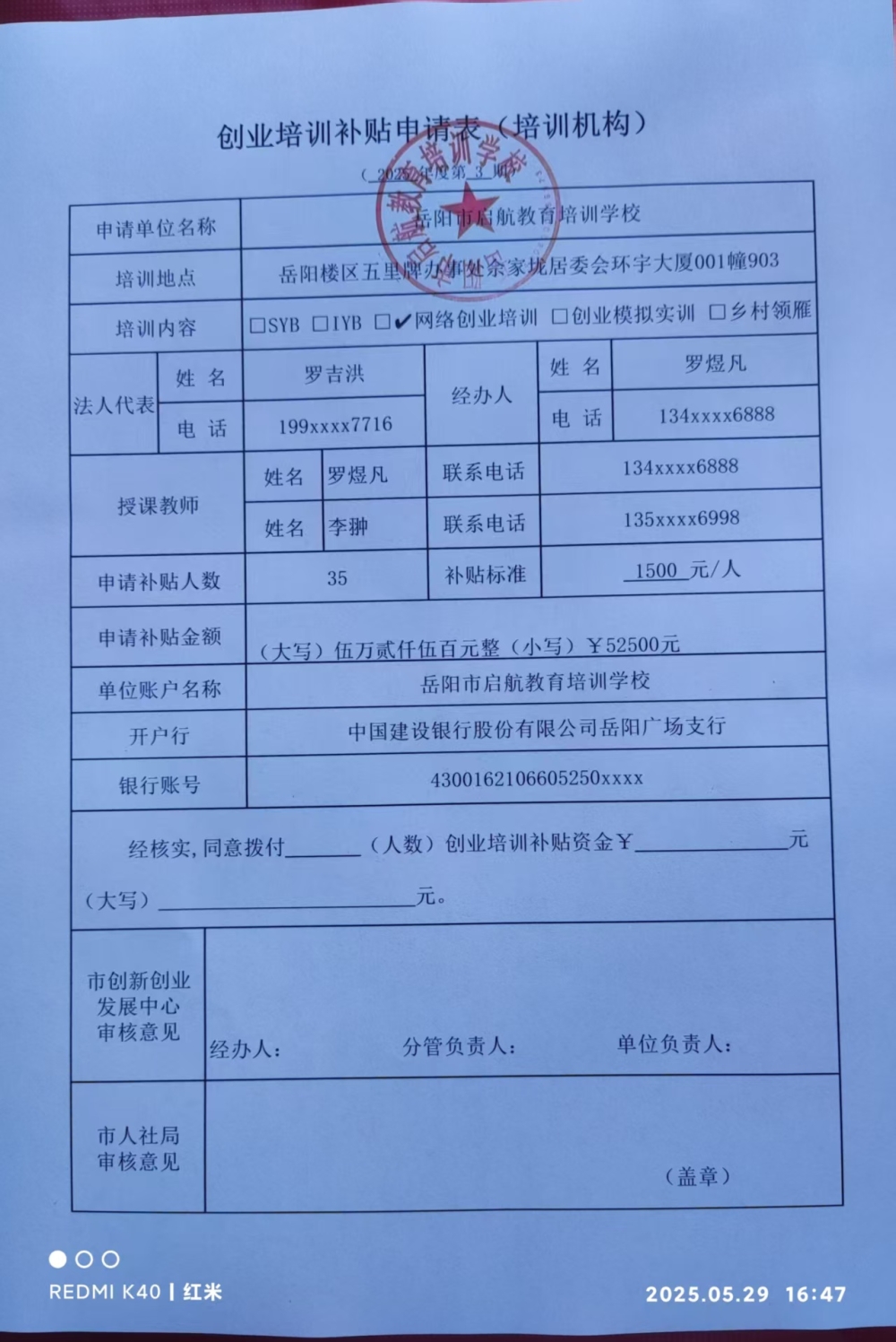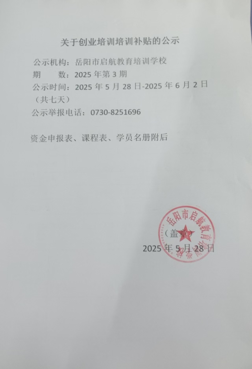 岳阳市启航教育培训学校2025年第三期网络创业培训资金申请表、课程表、学员名册