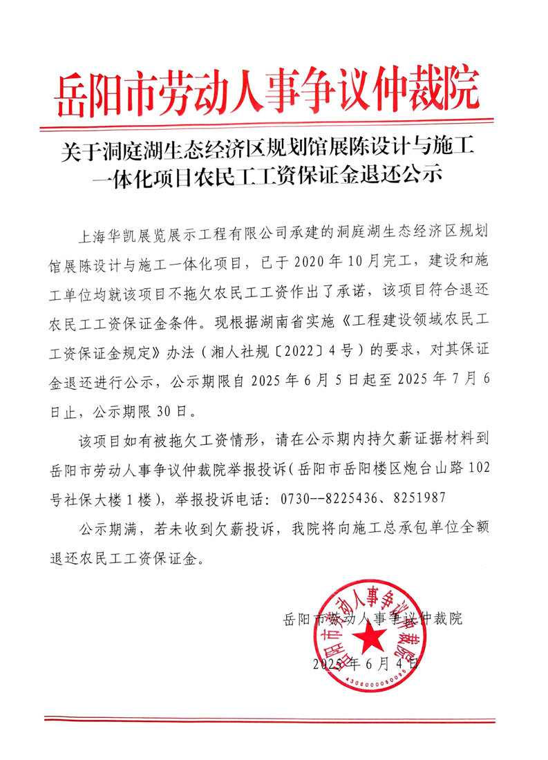 关于洞庭湖生态经济区规划馆展陈设计与施工一体化项目农民工工资保证金退还公示