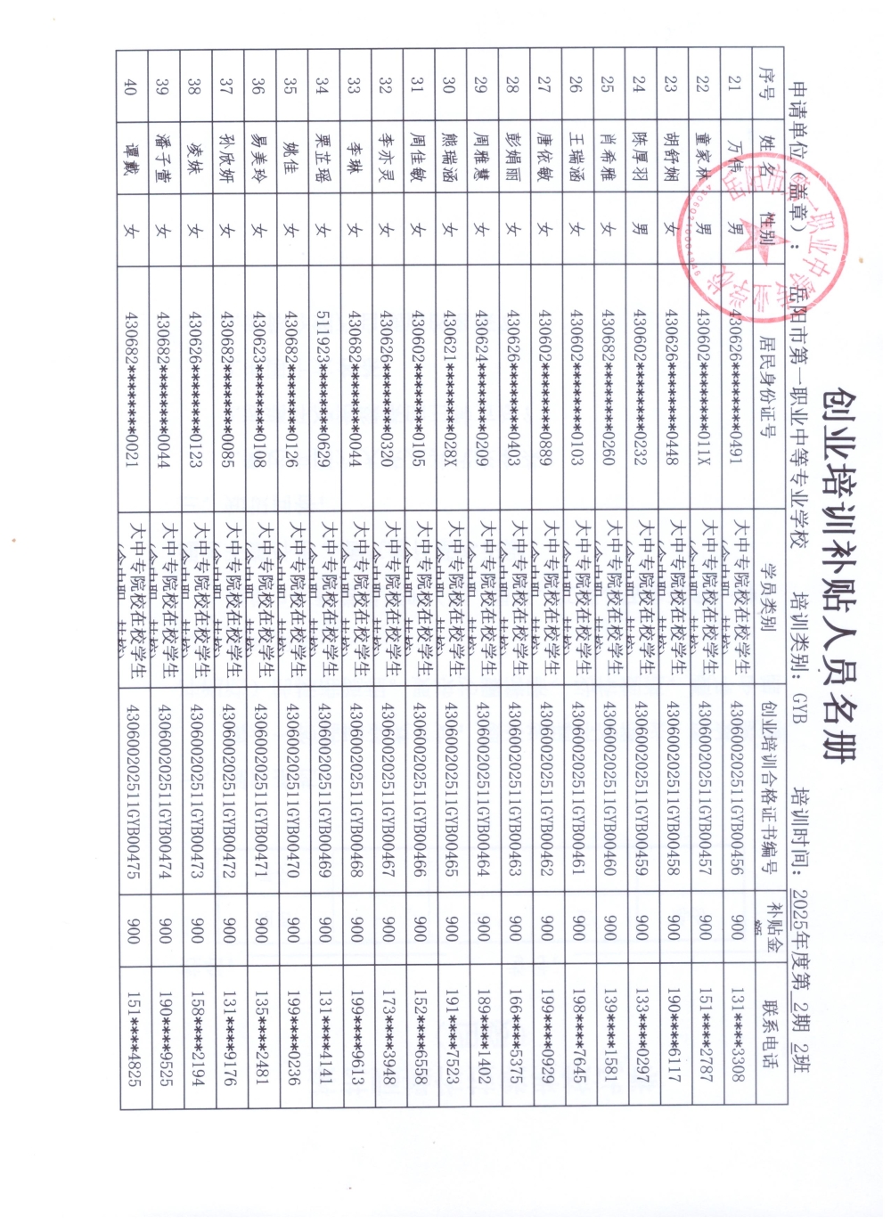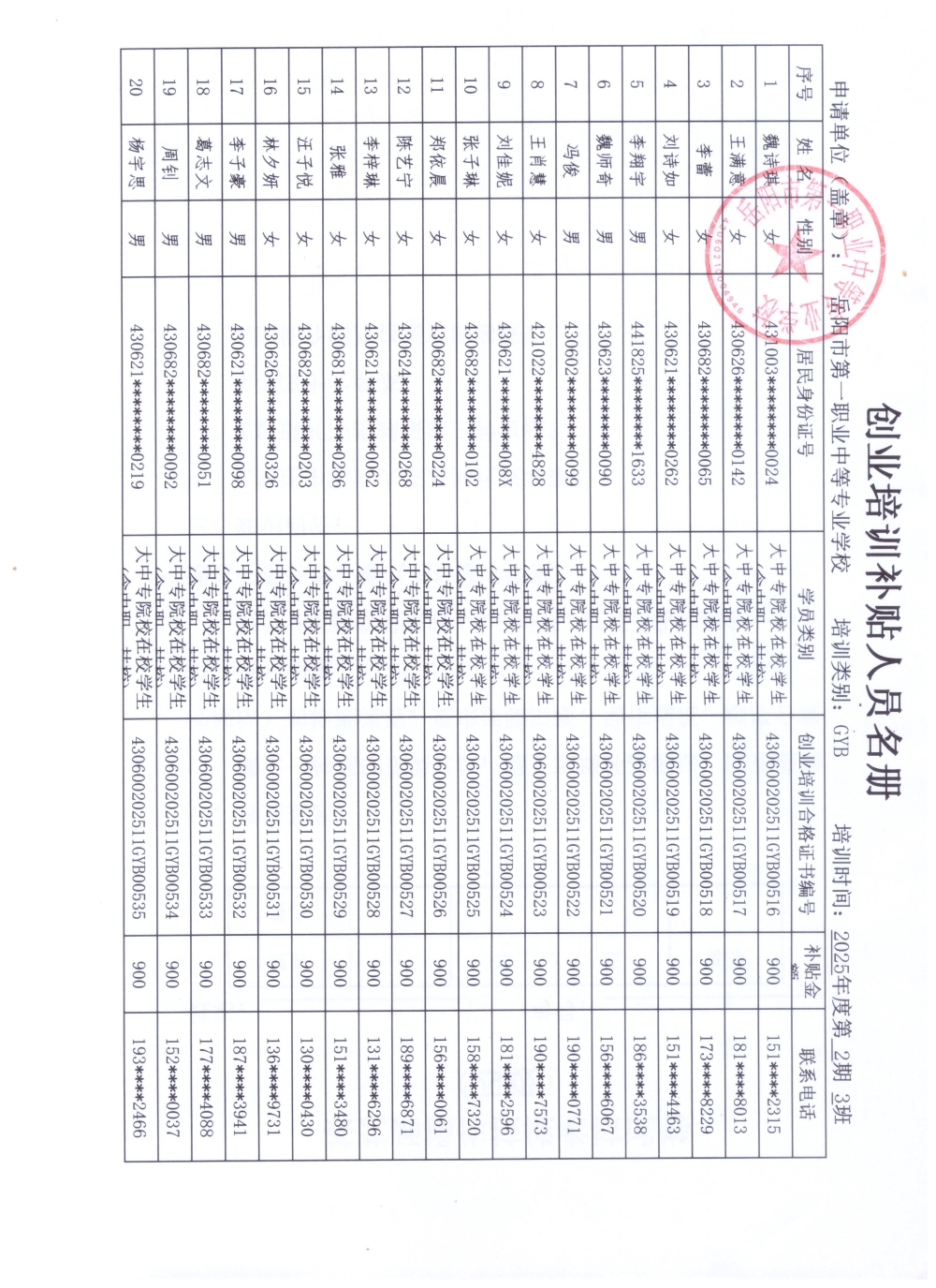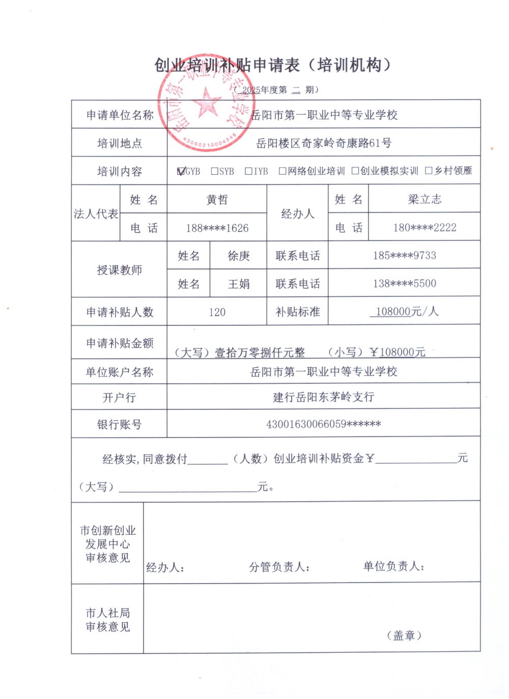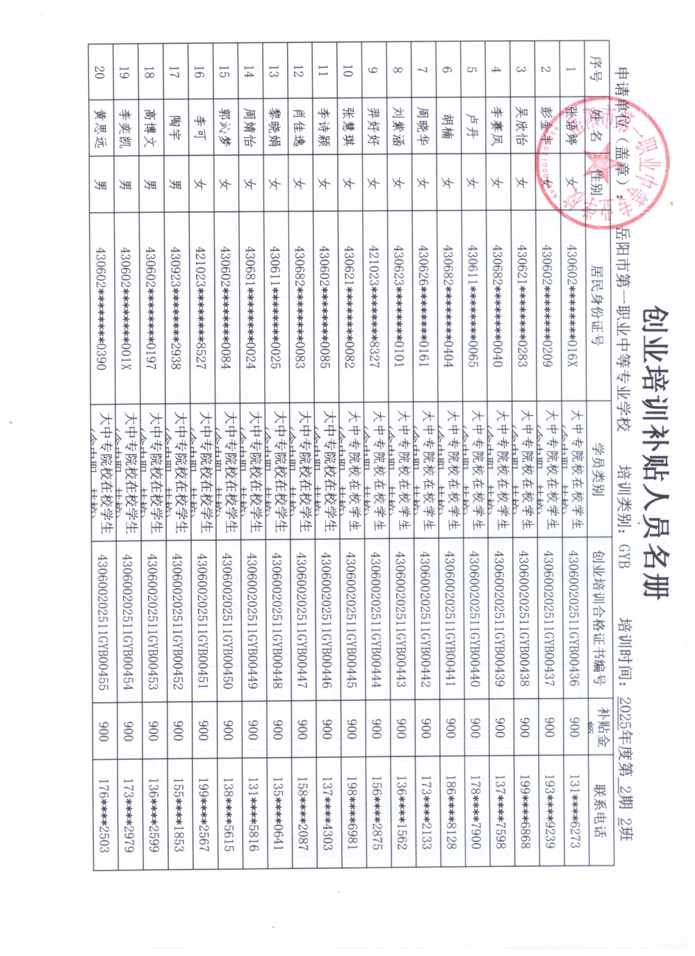 岳阳市第一职业中等专业学校2025年第二期GYB创业培训资金申请表、课程表、学员名册