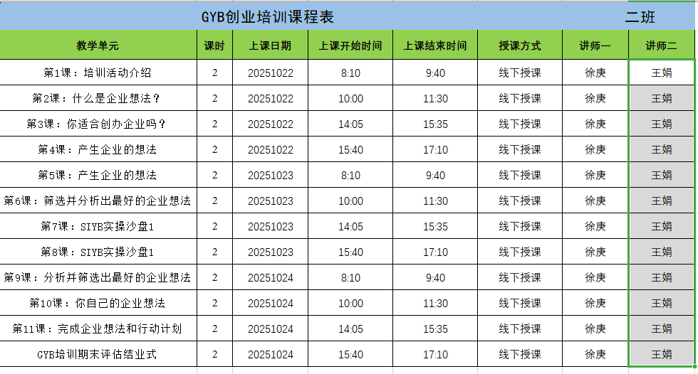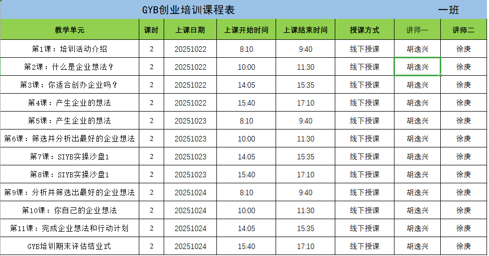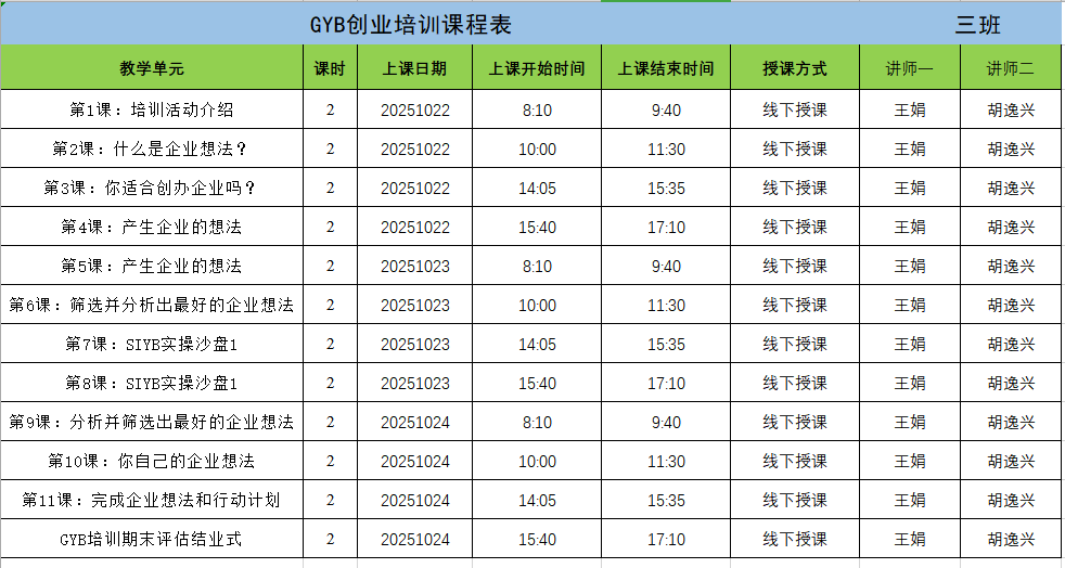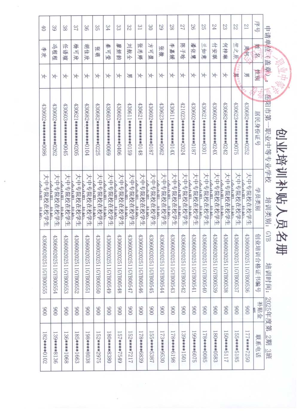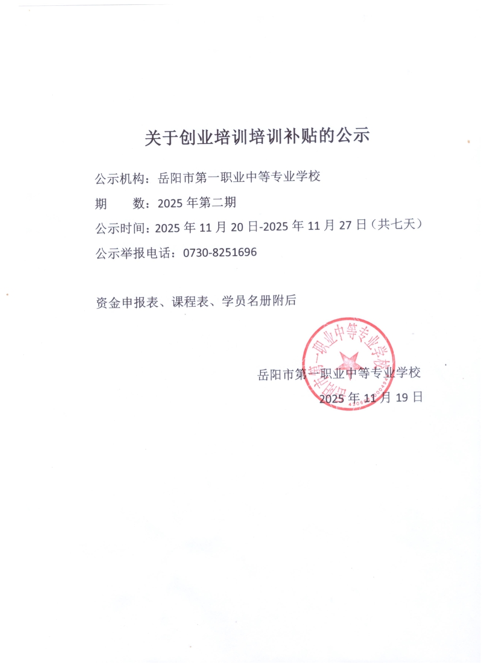 岳阳市第一职业中等专业学校2025年第二期GYB创业培训资金申请表、课程表、学员名册