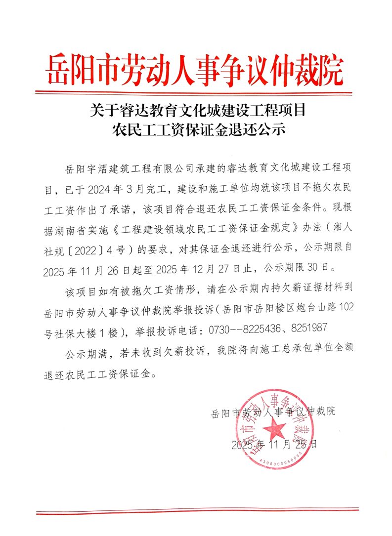 关于睿达教育文化建设工程项目农民工工资保证金退还公示