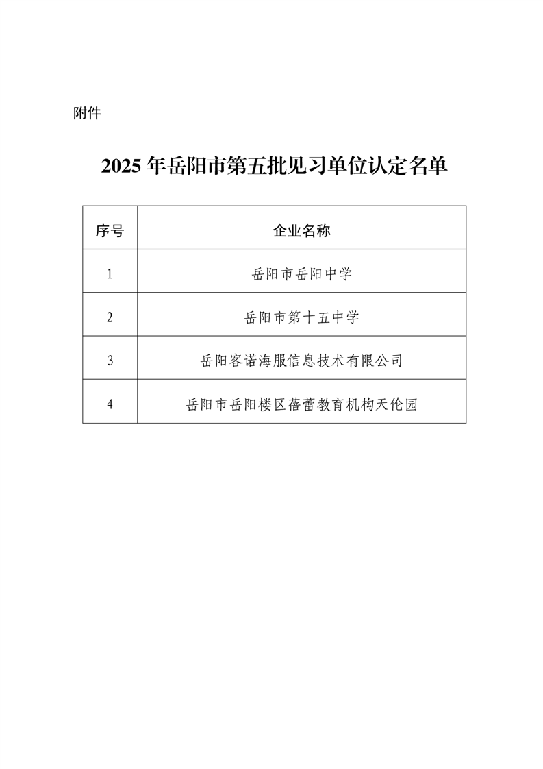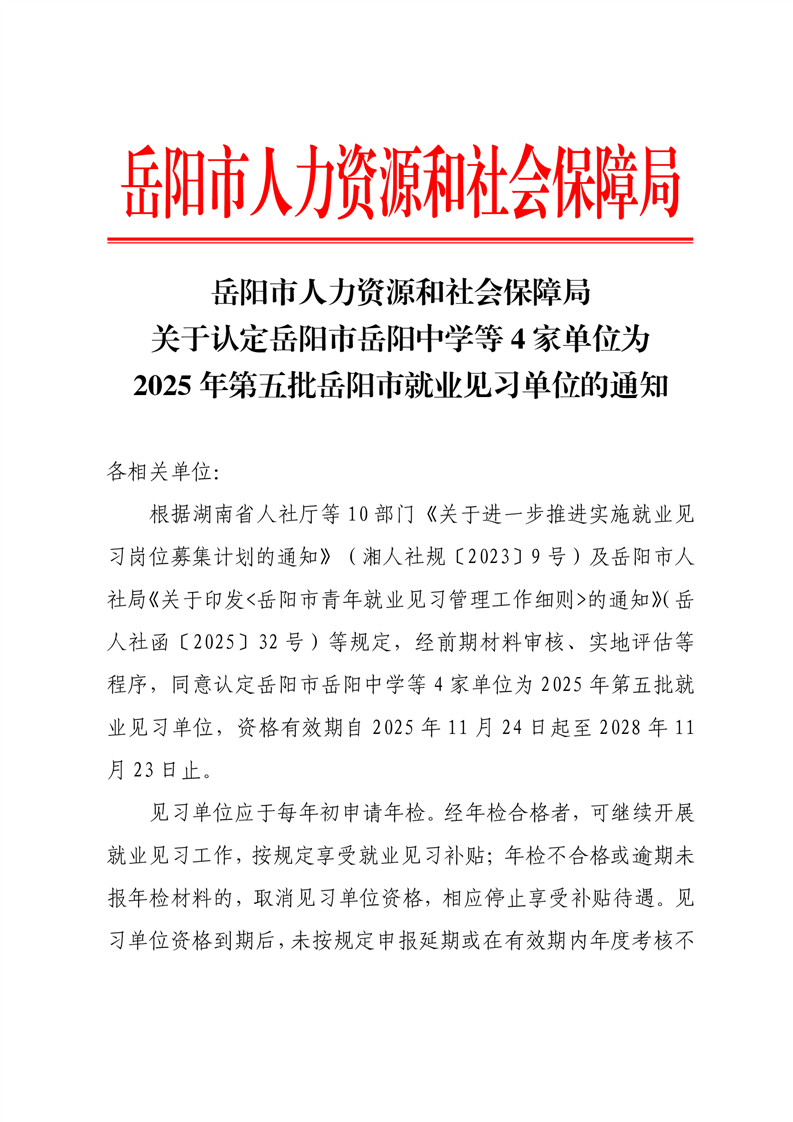 关于认定岳阳市岳阳中学等4家单位为2025年第五批岳阳市就业见习单位的通知