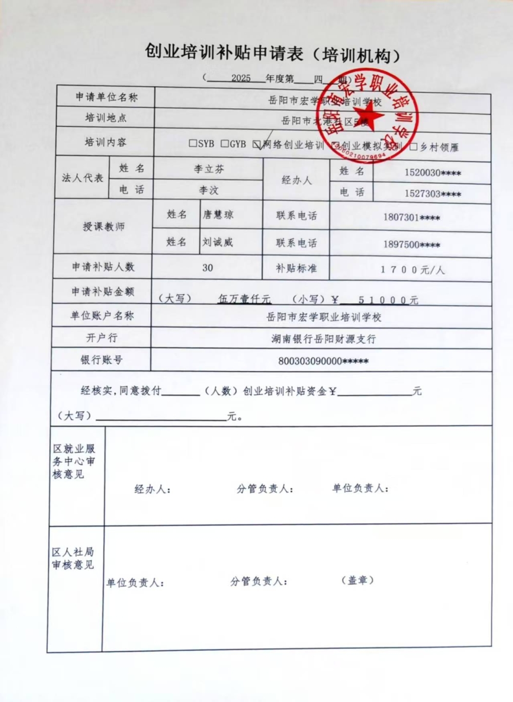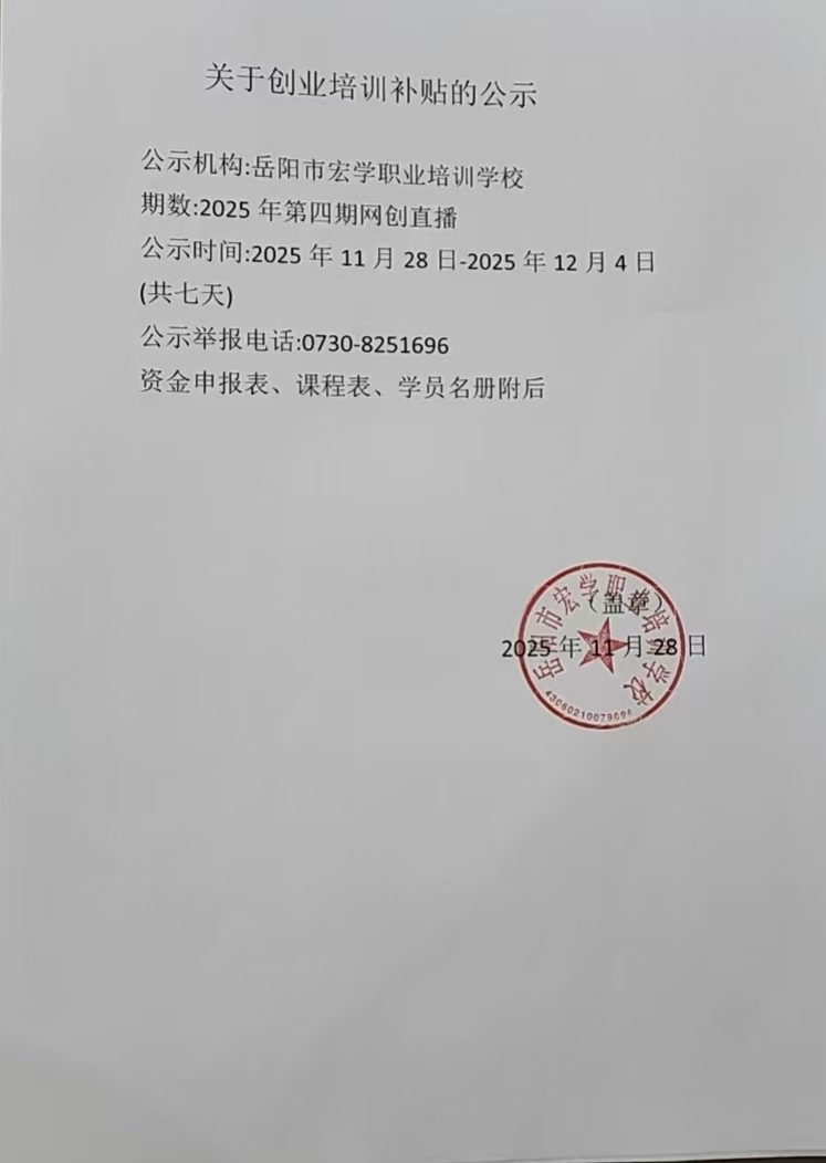 岳阳市宏学职业培训学校2025年第四期网络创业培训资金申请表、课程表、学员名册