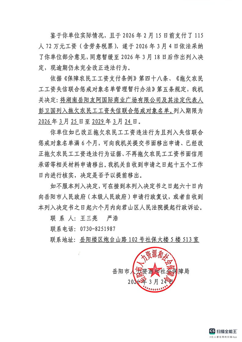 湖南岳阳友阿国际商业广场有限公司《列入拖欠农民工工资失信联合惩戒对象名单决定书》