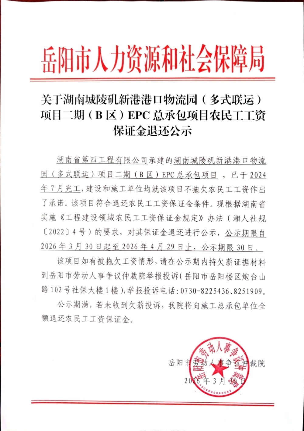关于湖南城陵矶新港港口物流园(多式联运)项目二期(B区)EPC总承包项目农民工工资保证金退还公示
