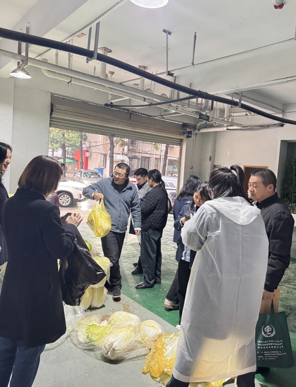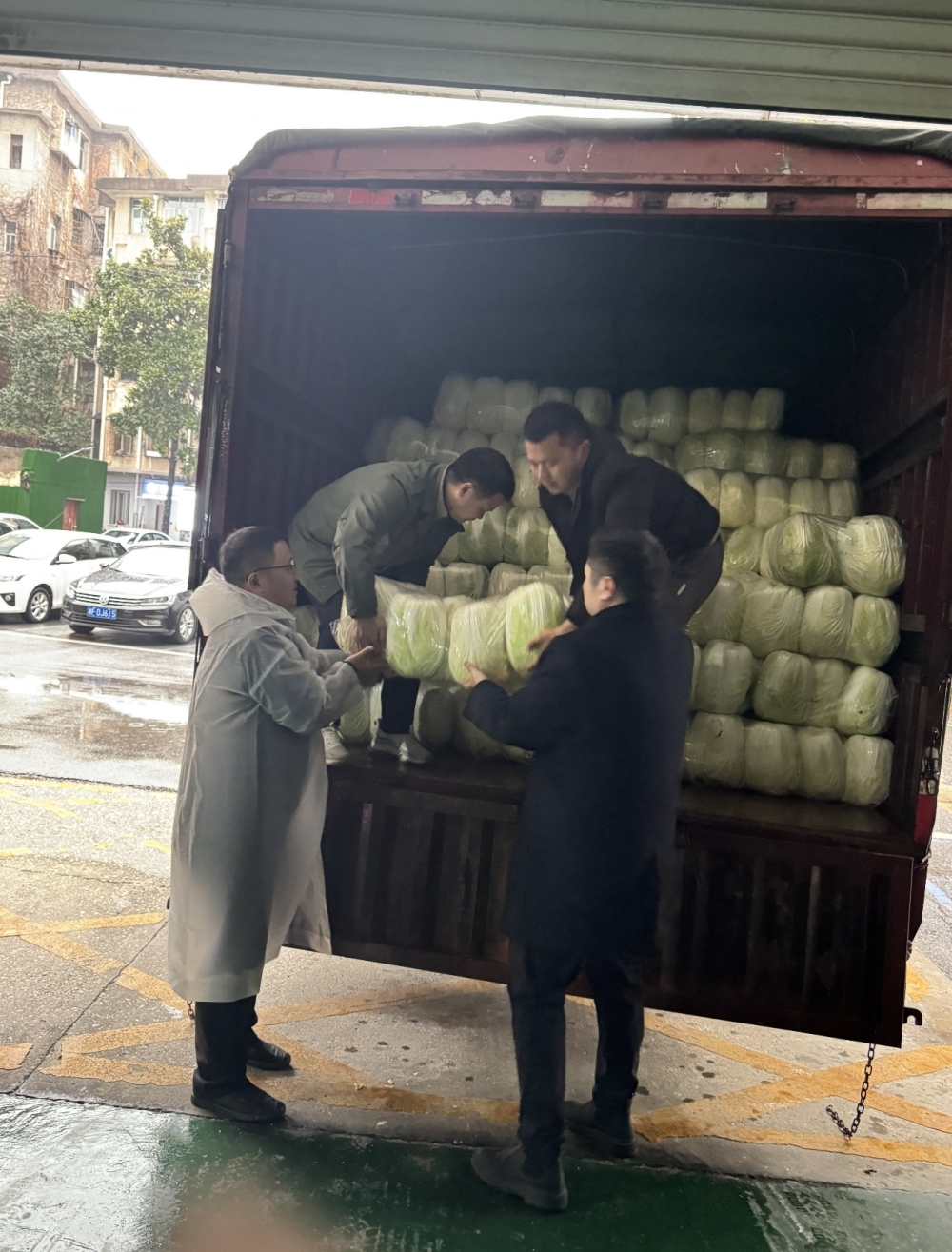历经三个多小时的雨中劳作,一辆卡车被塞得满满当当。中午,党员们顾不上休息,冒雨把“爱心大白菜”运往五里牌政务中心和祥源小学附近,迅速搭建起临时发放点。“新鲜的白菜免费领!”随着响亮的吆喝声,市民们有序地围拢过来领取白菜。退休工人赵大爷领到白菜后,感动地说:“白菜虽普通,惠民暖人心。”