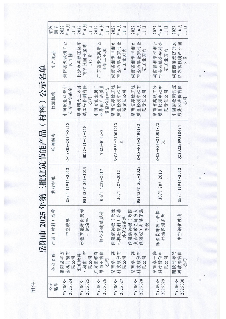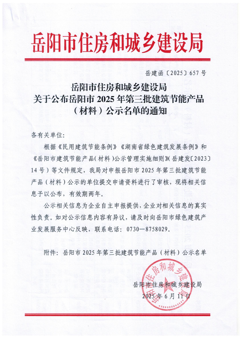 岳阳市住房和城乡建设局关于公布岳阳市2025年第三批建筑节能产品(材料)公示名单的通知