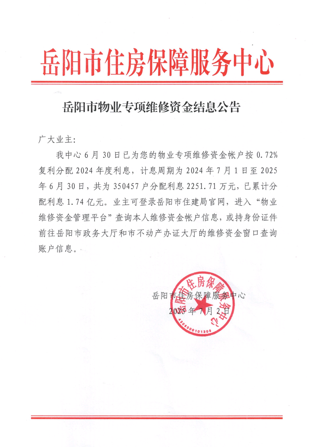 岳阳市物业专项维修资金结息公告