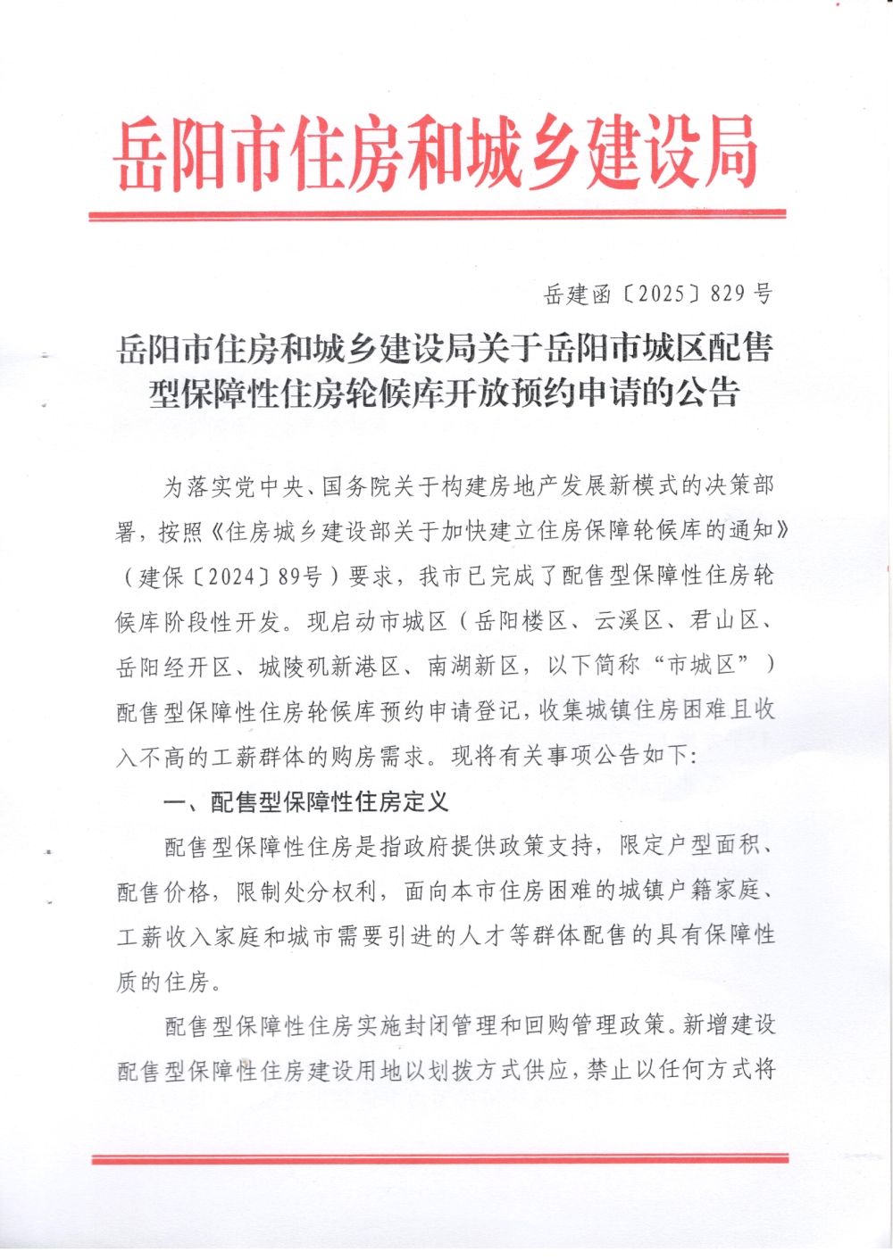 岳阳市住房和城乡建设局关于岳阳市城区配售型保障性住房轮候库开放预约申请的公告