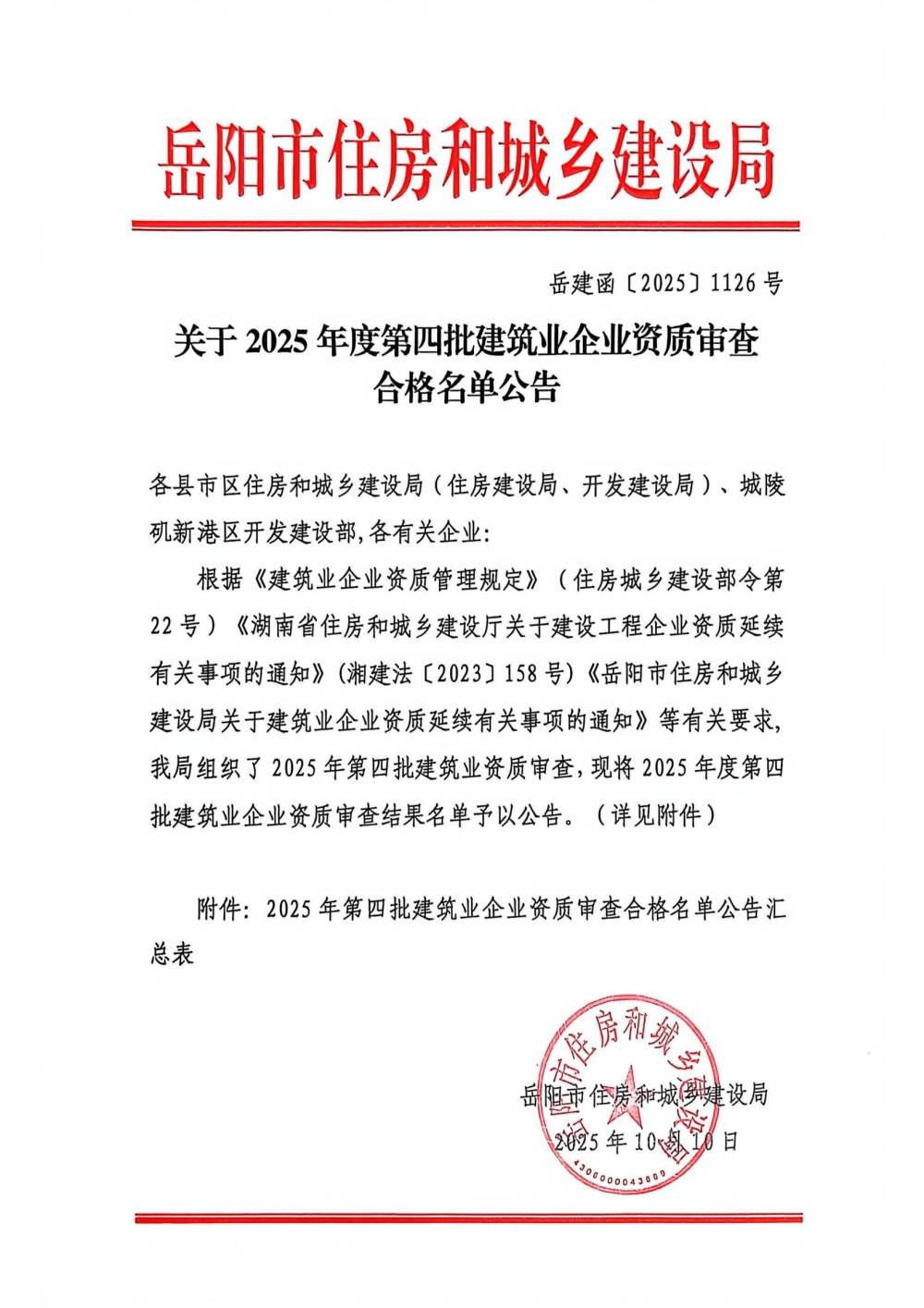 关于2025年度第四批建筑业企业资质审查合格名单公告