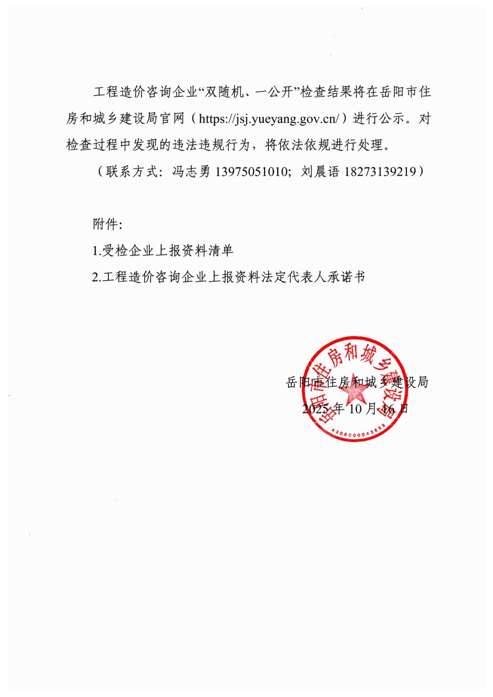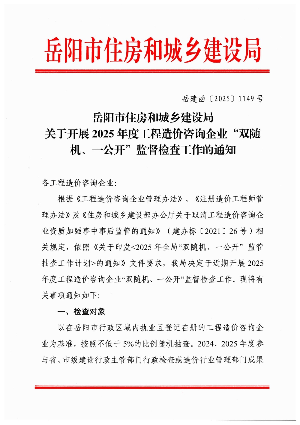 岳阳市住房和城乡建设局关于开展2025年度工程造价咨询企业“双随机、一公开”监督检查工作的通知