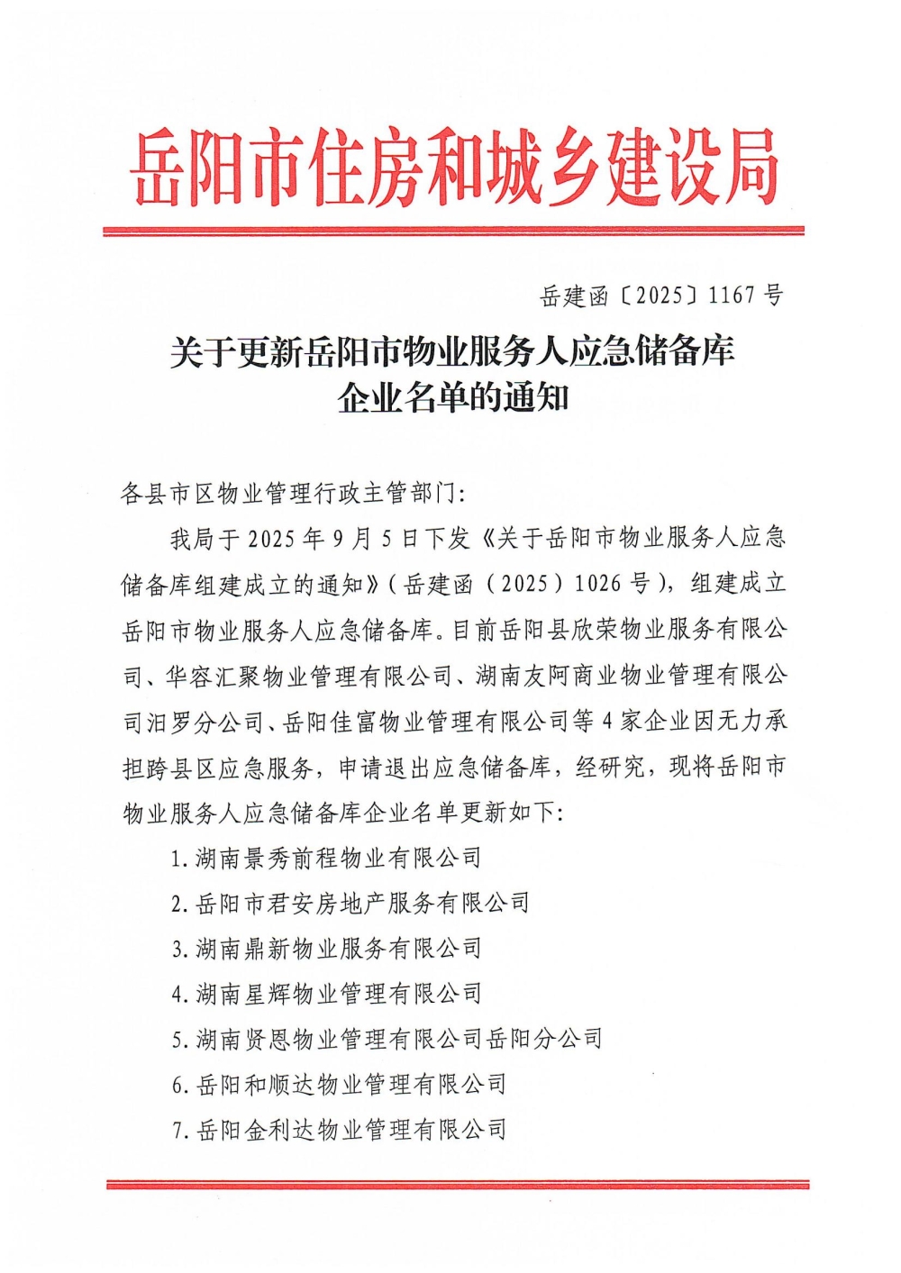 关于更新岳阳市物业服务人应急储备库企业名单的通知