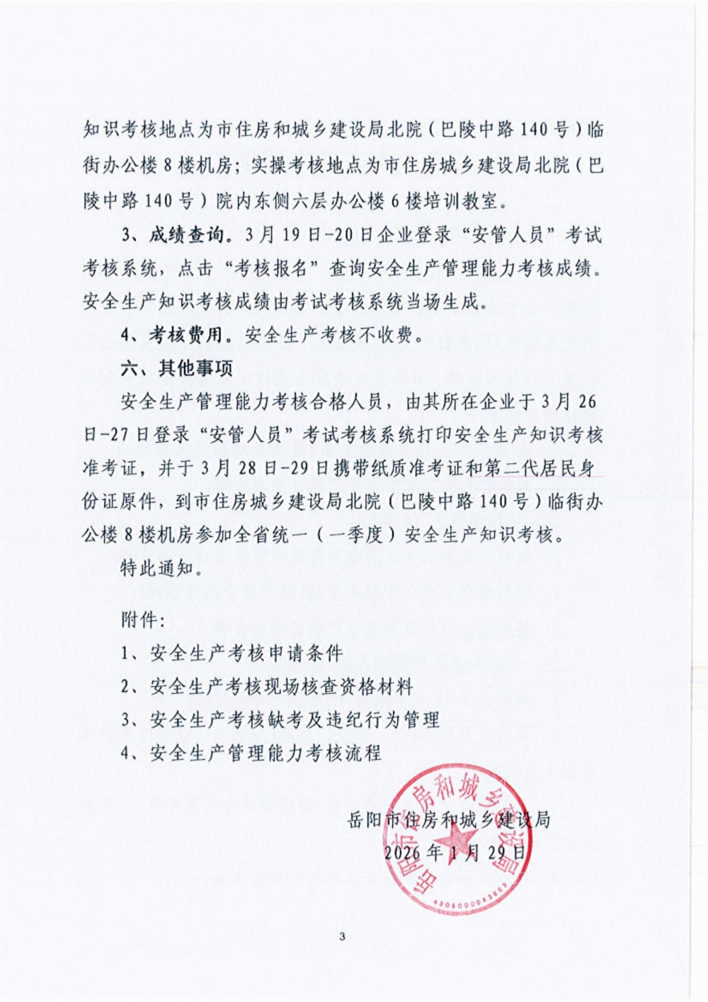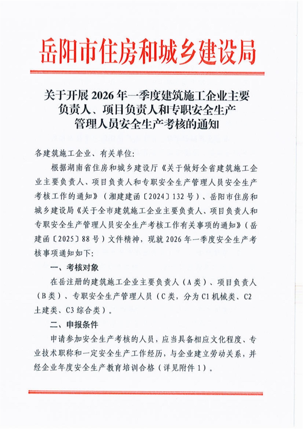 关于开展2026年一季度建筑施工企业主要负责人、项目负责人和专职安全生产管理人员安全生产考核的通知