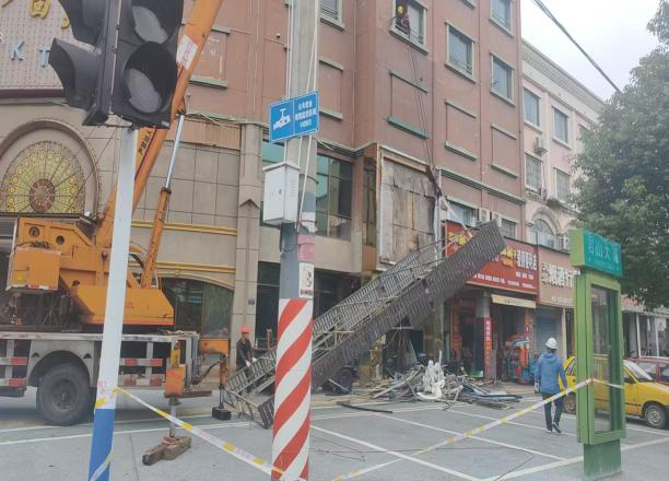 此次拆除行动的起因,是9月17日晚12345公众服务热线分派的紧急工单——亚华市场临街的“梦回大唐”广告牌出现松动,存在重大安全风险。接到工单后,君山大队迅速响应,连夜赶赴现场勘查。经核查发现,该广告牌因设置时间久、固定结构老化,在风雨天极易掉落,对过往行人和车辆构成极大威胁。为保障群众安全,大队第一时间在现场拉设安全警戒线,防止意外发生;次日即制定拆除方案,调派施工队伍与高空作业设备有序开展拆除作业。