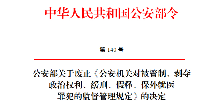 公安部关于废止《公安机关对被管制、剥夺政治权利、缓刑、假释、保外就医罪犯的监督管理规定》的决定(公安部令第140号)