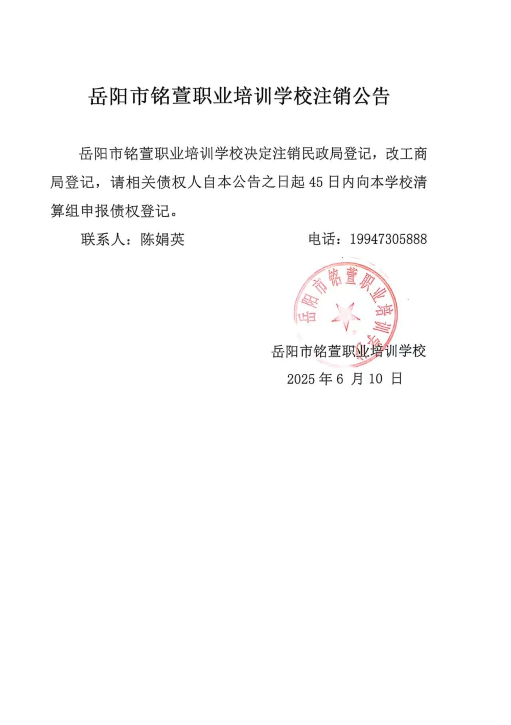 岳阳市铭萱职业培训学校注销公告