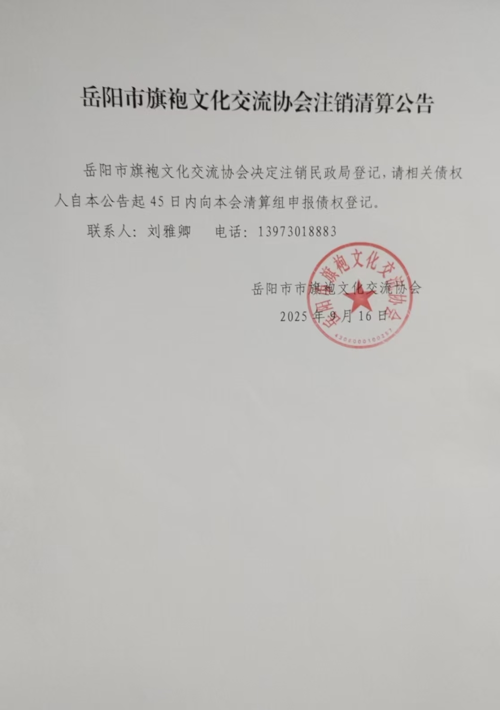岳阳市旗袍文化交流协会注销清算公告